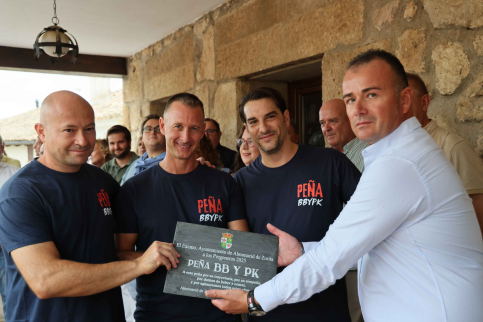 Fue entonces cuando, en nombre de BB y PK, José Ángel Plaza tomó el micrófono y resumió con entusiasmo el sentir de su peña. “Es un verdadero orgullo para nosotros ser los pregoneros de 2025. Queremos dar las gracias a cada una de las personas de esta villa histórica de Almonacid y, muy especialmente, a los que formáis cada una de las 31 peñas del pueblo. En realidad, vosotros sois los verdaderos pregoneros de nuestras fiestas, porque sois quienes lleváis el nombre y las bondades de Almonacid allá donde vais. Una peña es mucho más que un local donde reunirse durante una semana al año: es una familia. Por eso debemos cuidar el nombre que le damos, porque puede durar décadas y ser heredado por nuestros hijos. Para quienes no pueden estar aquí por motivos de salud o de trabajo, deseamos que estas fiestas sean la guinda del verano, un motivo para olvidar las penas y recordar que seguimos vivos. ¡Felices fiestas!”, señaló. Sus palabras arrancaron una gran ovación, que culminó con la entrega de una placa conmemorativa por parte del alcalde y con los tradicionales vivas a la Virgen de la Luz, a Almonacid y a España y con el sonido del chupinazo, desde la Torre del Reloj, que envió Manuel Toledano, Tole.