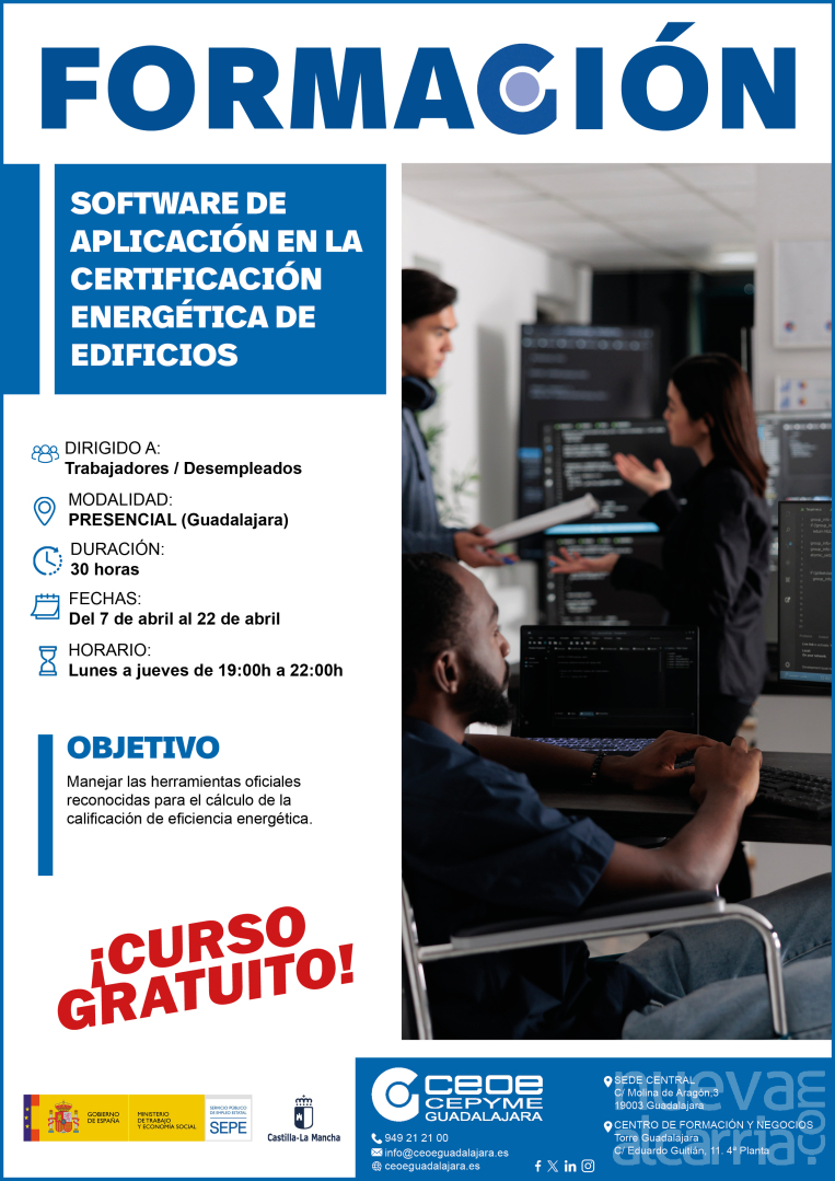 El departamento de Formación de CEOE-CEPYME Guadalajara ha informado de la apertura del plazo de inscripción para el curso gratuito “Software de aplicación en la certificación energética de edificios”, dirigido a personas trabajadoras y desempleadas. La formación se desarrollará del 7 al 22 de abril.