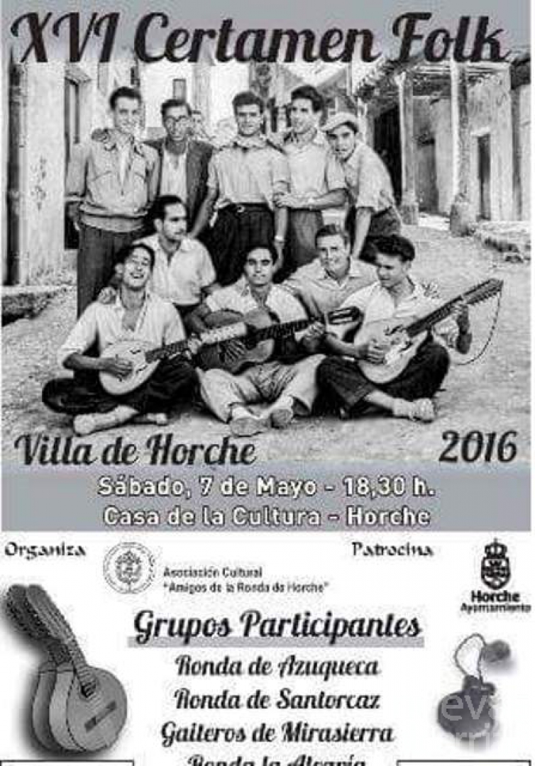 Dentro del programa de actividades culturales ofertado por el Ayuntamiento de Horche en colaboración con las distintas asociaciones y colectivos del municipio, tendrá lugar el próximo sábado 7 de mayo la celebración de la XVIª edición del Certamen de Música Folk “Villa de Horche”. El acto está organizado por la Asociación de Amigos de la Ronda de Horche y cuenta con el patrocinio del Ayuntamiento y de una serie de entidades colaboradoras, en su mayoría comercios e industrias vinculadas a la localidad.