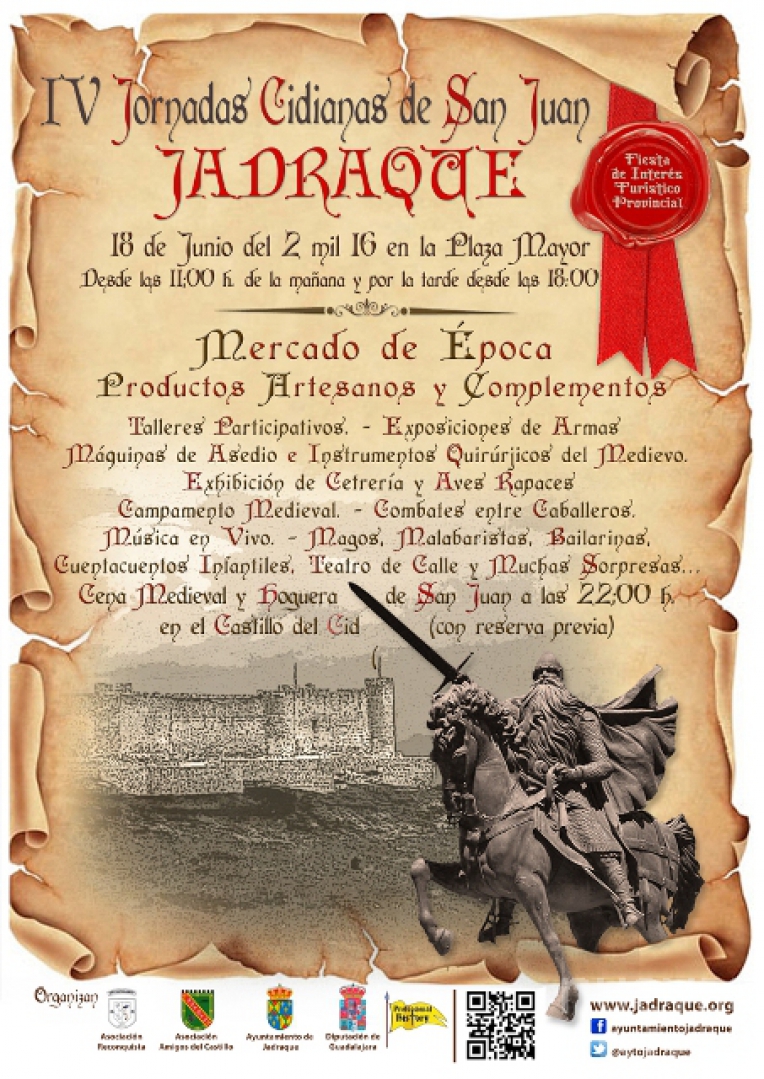 la Jornada Cidiana de San Juan que se celebrará el sábado 18 de junio en Jadraque. Durante todo el día, desde las 11 de la mañana, ambientación medieval en la plaza Mayor. El Pregón tendrá lugar a las 12h. en la plaza del Ayuntamiento a cargo de la jadraqueña Teresa Rojo Rojo. Tras el descanso de la comida, la actividad se reanudará en la plaza Mayor a las 18h. A las 18:30h. entrega de los premios de los concursos infantiles en la plaza Mayor. A las 19H. en el Casino de Jadraque, el escritor y periodista Antonio Pérez Henares presenta su último libro con entrada libre. A las 22h. en el Castillo de Jadraque, cena medieval y hoguera de San Juan, declaradas de Interés Turístico Provincial.
