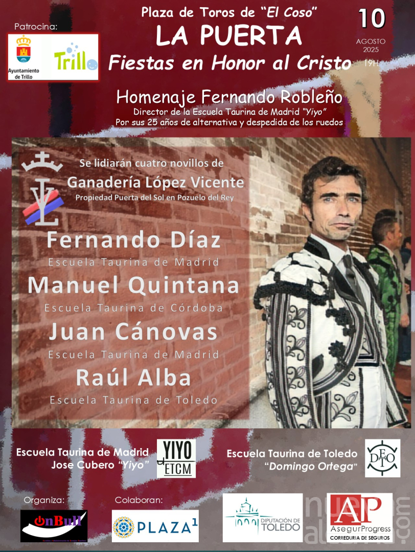 En el cartel de este año destaca la inclusión de Juan Cánovas oriundo de Cifuentes y alumno de la Escuela de Madrid. También comparece Raúl Alba perteneciente a una dinastía de toreros y ganaderos toledanos.