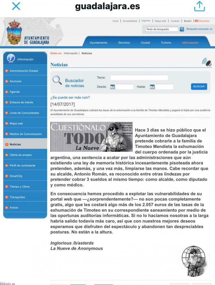 Según la informacion publicada en eldiario.es y confirmada por este medio el grupo activista La Nueve, grupo afín a Anonymous, ha conseguido acceder al servidor del Ayuntamiento de Guadalajara para colocar un mensaje con el que pretenden criticar la decisión del Ayuntamiento, gobernado por el PP, de cobrar una tasa de más de 2.000 euros por la exhumación de los restos de Timoteo Mendieta, asesinado por el franquismo.