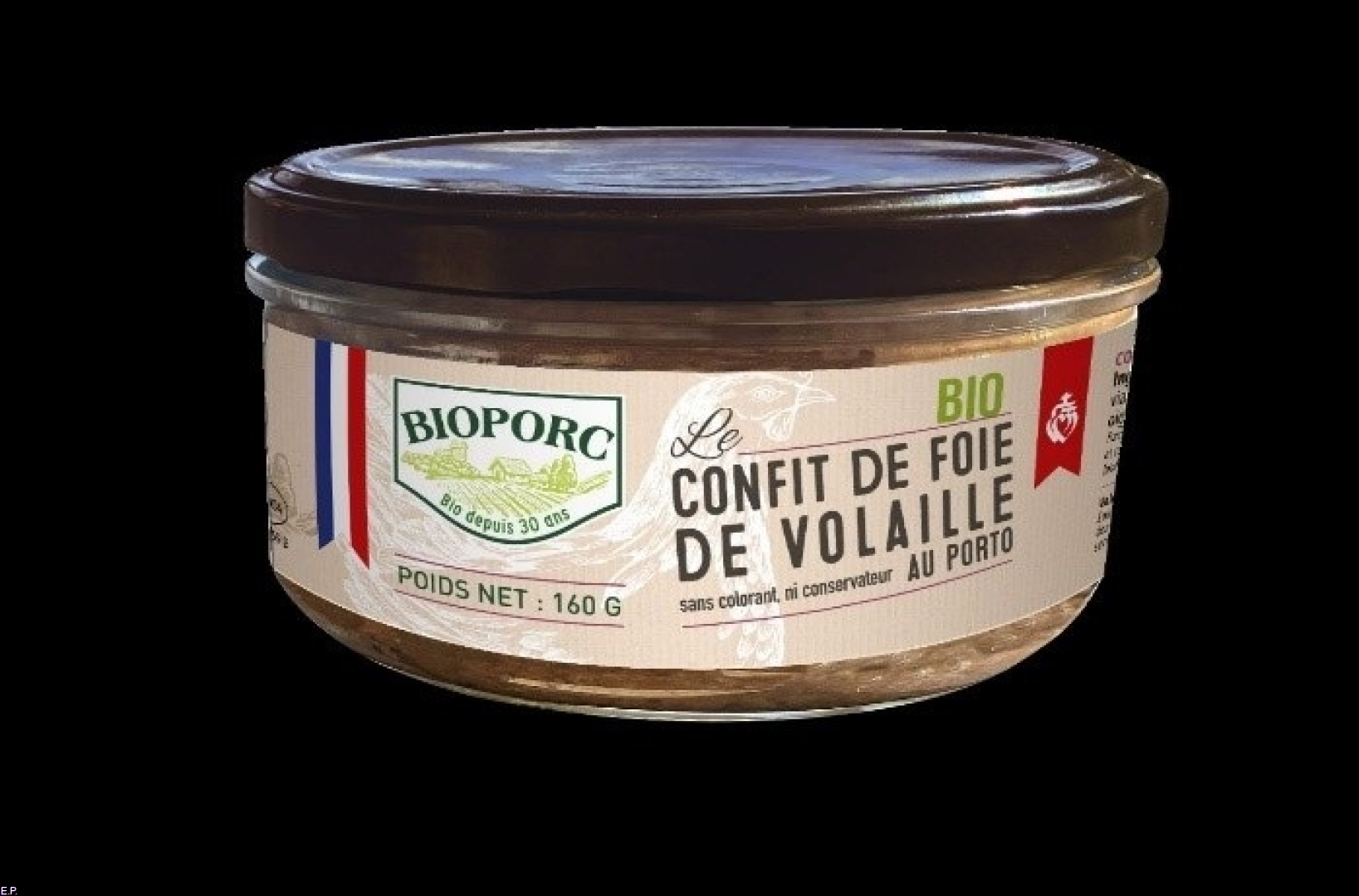 El producto en cuestión es 'Confit de foie de volaille au porto/ confit de hígado de ave al oporto' de la marca Bioporc. Está envasado en tarro de cristal con tapa metálica, con un peso de unidad de 120 gramos.