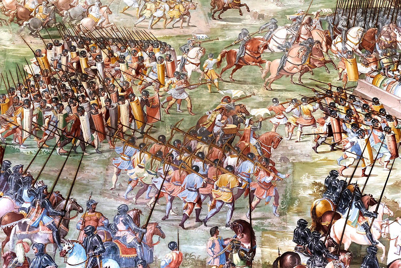 Decir ahora la palabra guerra es evocar momentos (siempre malos, los de las guerras) pero lustrosos y con mensaje: telas de colores, sonidos de trompeta, prisioneros ilustres y una comedida razón de “bellas artes” aplicadas [desde el prisma del Renacimiento] a las batallas campales y sus prolegómenos.