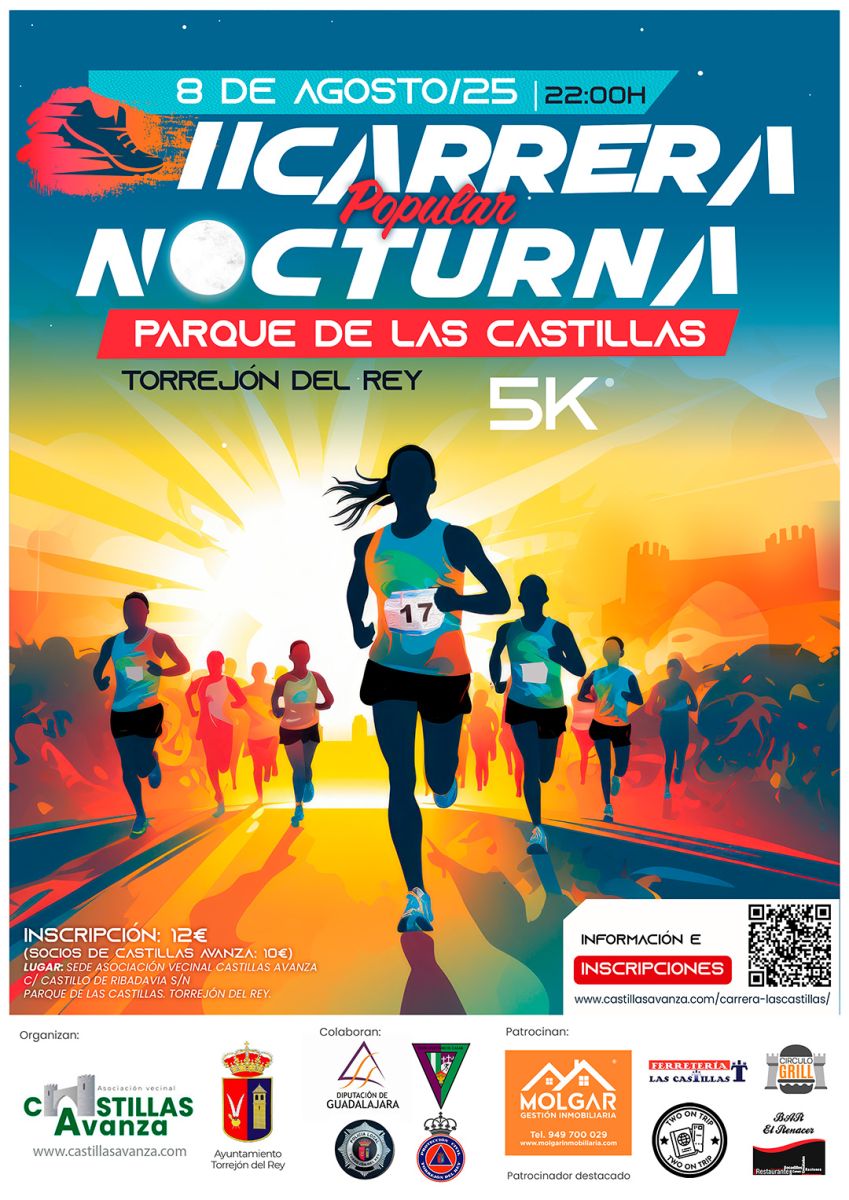 La carrera, organizada con la colaboración del Exmo. Ayuntamiento de Torrejón del Rey, tendrá lugar el viernes 8 de agosto, con la entrega de dorsales a partir de las 20.00 horas y la salida programada para las 21.00 horas.