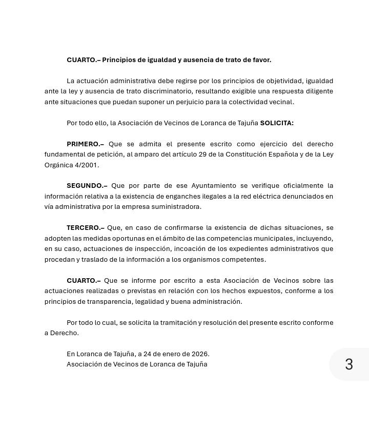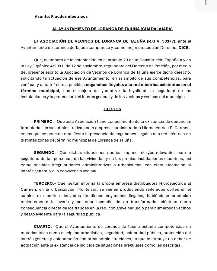 La Asociación de Vecinos de Loranca de Tajuña ha formalizado una nueva ofensiva administrativa para frenar lo que califican como una situación de riesgo e impunidad sostenida en el tiempo. La entidad ha presentado por registro oficial un escrito ante el Ayuntamiento de Loranca y el Servicio de Industria y Energía de la Junta en Guadalajara para denunciar la proliferación de enganches ilegales a la red eléctrica, un fraude que, según los afectados, está comprometiendo la seguridad física de los residentes de la urbanización Montejaral.