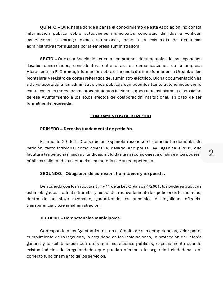 La denuncia se fundamenta en los informes de la distribuidora Hidroeléctrica El Carmen, que atribuye a estas manipulaciones ilícitas los reiterados cortes de suministro y, en el episodio más grave registrado hasta la fecha, el incendio de un transformador. Para los vecinos, la situación ha traspasado el umbral de la molestia doméstica para convertirse en un problema de seguridad pública: "Estamos ante una desidia que pone en riesgo las instalaciones y a las personas", señalan desde la asociación.