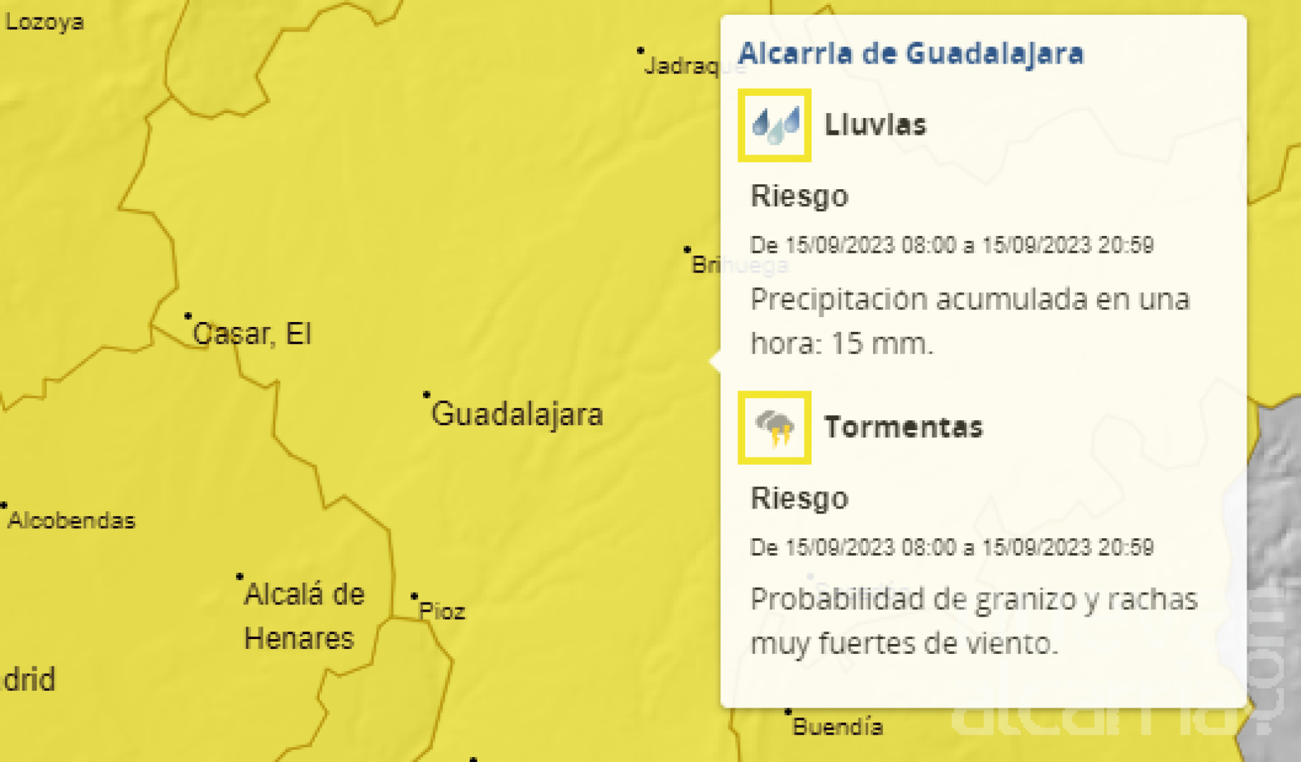La Agencia Estatal de Meteorología (Aemet) ha emitido una alerta amarilla que se mantendrá hasta las 21:00 horas de hoy viernes, debido a la previsión de lluvias y tormentas con posibilidad de granizo. Este aviso afecta a toda la región de La Alcarria y a Guadalajara, si bien no implica necesariamente un impacto directo en la capital. Las probabilidades de precipitaciones oscilan entre el 40 y el 70 por ciento.