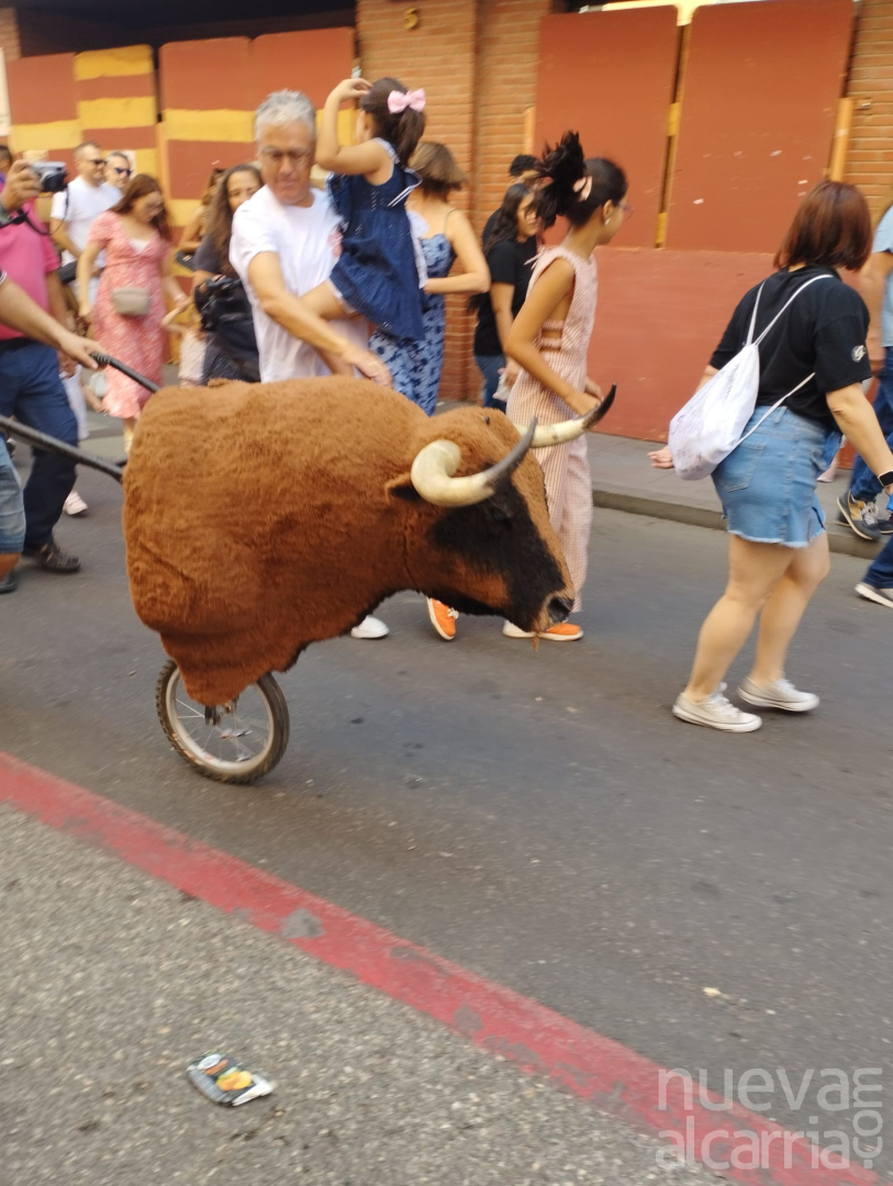 Con una velocidad aceptable llegaron hasta el Coso de las Cruces donde algunos tuvieron la oportunidad de mostrar su arte infantil como recortador antes de que se metieran en el toril, que en este caso fue la puerta por donde salen los caballos. Una vez que todos estuvieron dentro, colocados uno junto a otro y con los niños enfrente, estos entonaron a coro el popular "A San Fermín pedimos por ser nuestro patrón, nos guíe en el enciero dándonos su protección". Y al acabar, los carretones volvieron a salir a protagonizar otra trepidante carrera por el albero. No hubo que lamentar cogidas, aunque más de uno sí se llevó un refrescante chorro de agua.