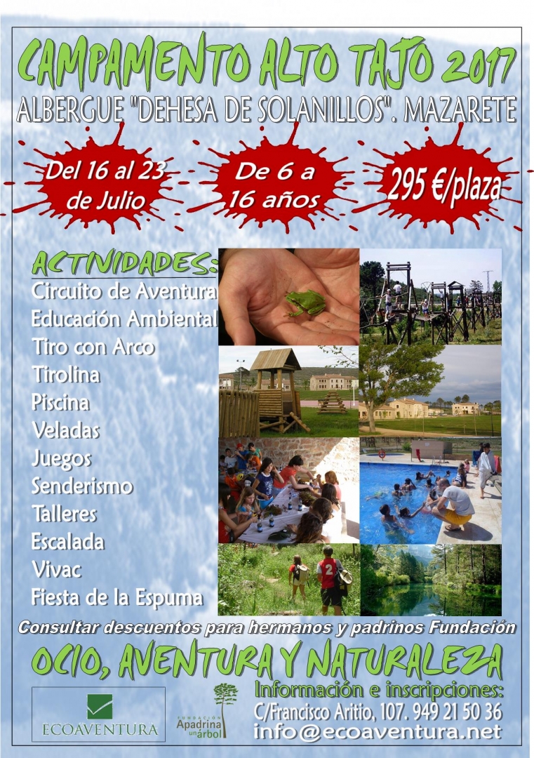 Ya se encuentra abierto el plazo de inscripción para el campamento de verano que se desarrollará durante el mes de julio en el Centro de Educación Ambiental Dehesa de Solanillos de Mazarete. Para esta ocasión, la Fundación ha decidido trabajar conjuntamente con Ecoaventura, empresa líder en el sector, que organizará un campamento repleto de actividades dirigidas a niños de seis a 16 años del 16 al 23 de julio. Los participantes se alojarán, en régimen de pensión completa, en habitaciones de dos a seis personas con baño privado, existiendo habitaciones adaptadas para discapacitados. Quien desee obtener más información al respecto o formalizar tu inscripción, puede llamar al 949 21 50 36 o escribir a info@ecoaventura.net.