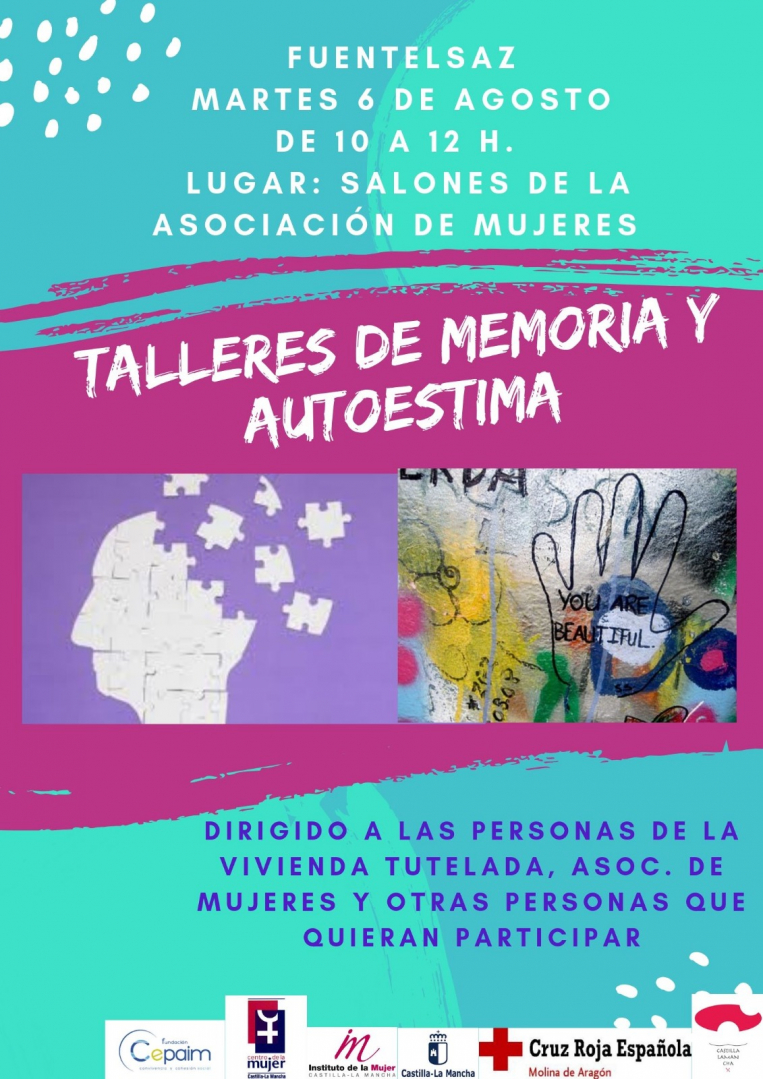 La localidad de Fuentelsaz ha preparado tres actividades de diferente índole, empezando el día 6 de agosto con unos “Talleres de Memoria y Autoestima”, dirigido a las personas de la vivienda tutelada, a la Asociación de Mujeres y a otras personas que quieran participar, en los salones de la Asociación de Mujeres de 10.00 a 12.00 horas y organizado por la Fundación CEPAIM, el Centro de la Mujer, el Instituto de la Mujer y Cruz Roja.