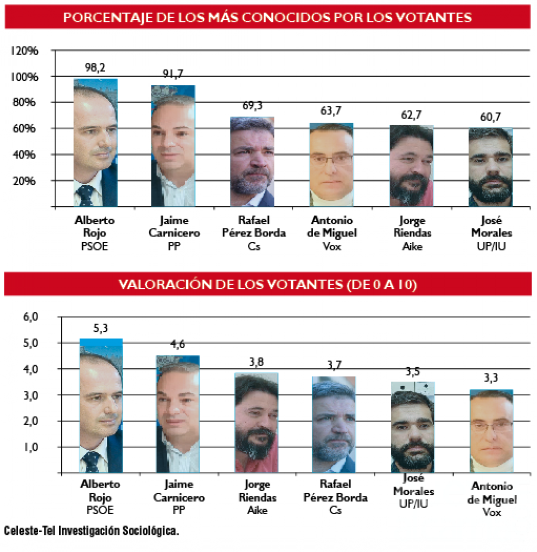 A Rojo le sigue en notoriedad Jaime Carnicero (PP), al que afirma conocer el 91,7 por ciento de los encuestados. En tercera posición se halla Rafael Pérez-Borda (Ciudadanos), con una notoriedad del 69,3%. Los menos conocidos son Antonio de Miguel (Vox), Jorge Riendas (Aike), y José Morales (Unidas Podemos-IU), con el 63,7%, 62,7% y 60,7%, respectivamente
