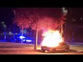 El sonido iba acompañado de cierto olor a quemado. "Cuando llamamos a la Policía para dar aviso, nos dijeron que ya estaban de camino", relata uno de los testigos. "Luego bajamos a la calle para ver de dónde procedía el ruido y el olor porque teníamos miedo de que viniera de un garaje". Sin embargo, lo que encontraron fue éste vehículo ardiendo en la calle Reino Unido esquina con la avenida Juan Pablo II.