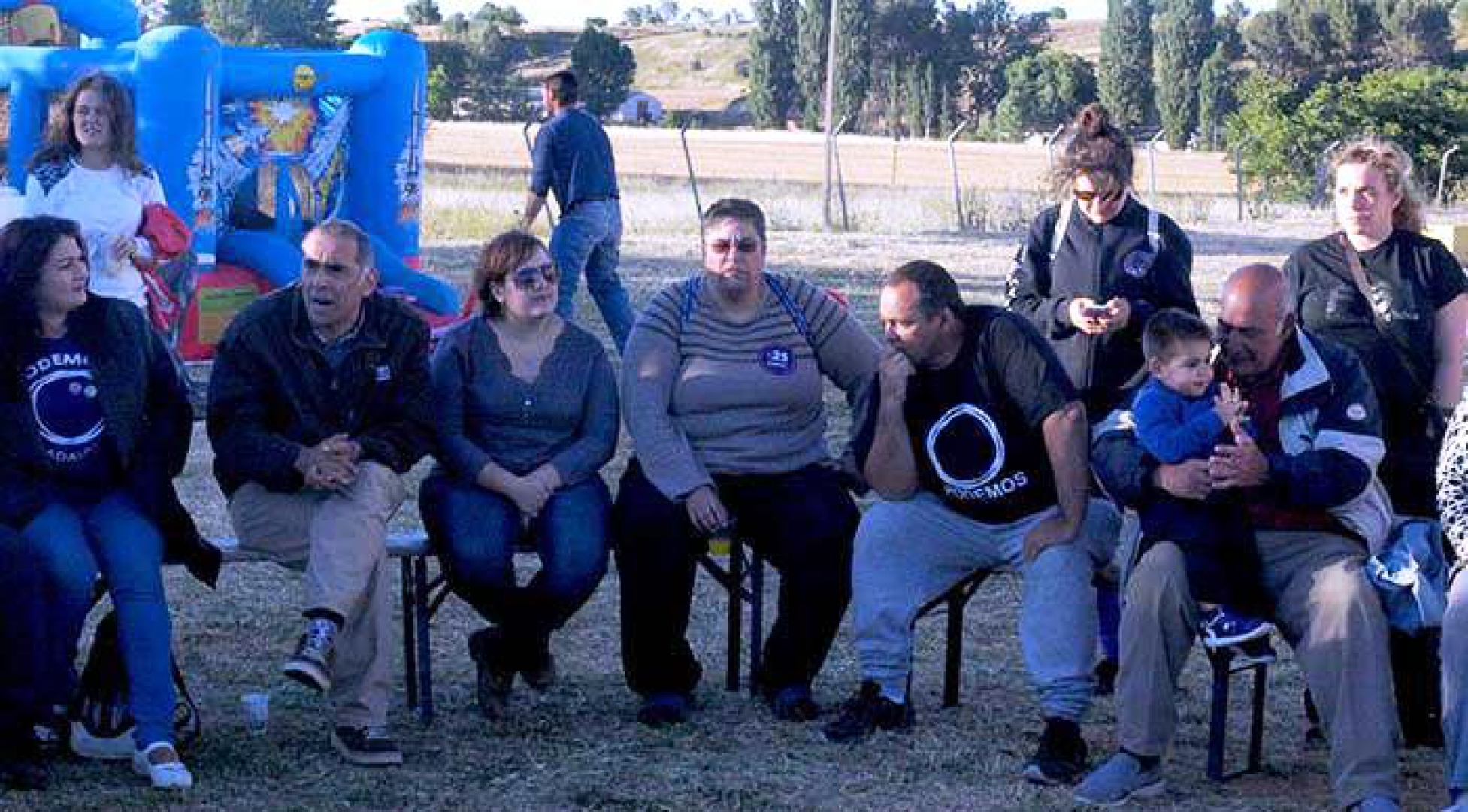 Unos 40 vecinos de Pioz elaboraron una gran paella para recibir a los candidatos de Unidos Podemos Ariel Jerez y Begoña Rojas. También acudió el alcalde, Ricardo García, elegido en 2015 por “Ahora Pioz”.