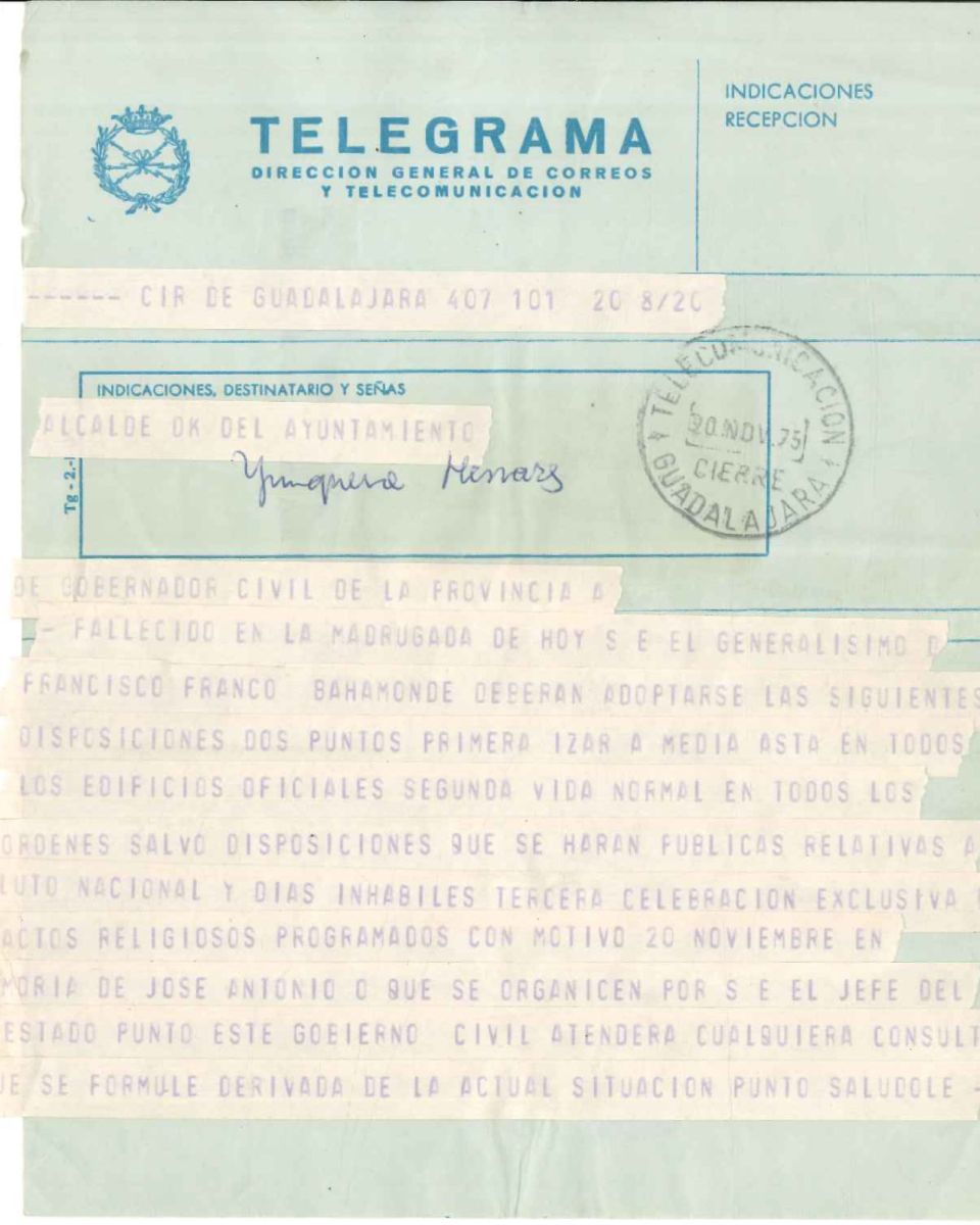 En Yunquera de Henares, el ayuntamiento recibió el telegrama el mismo 20 de noviembre de 1975. Las órdenes oficiales incluían: