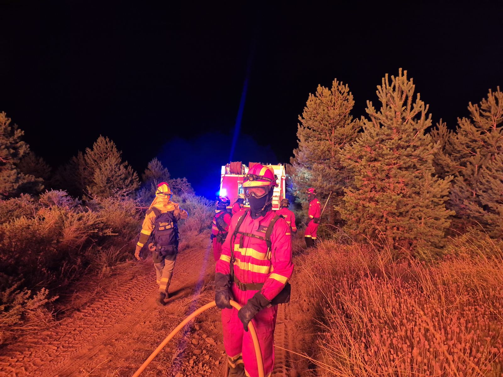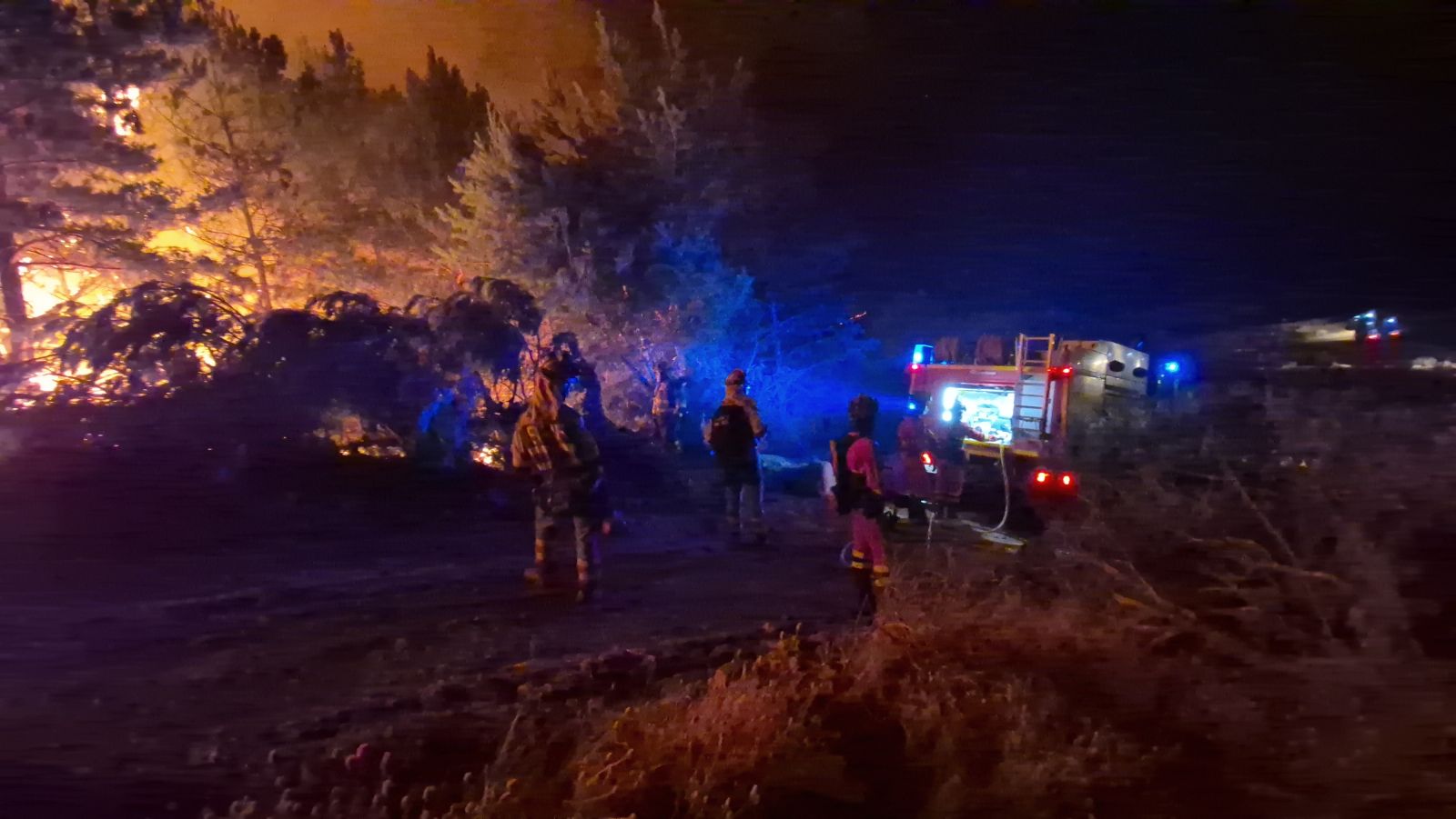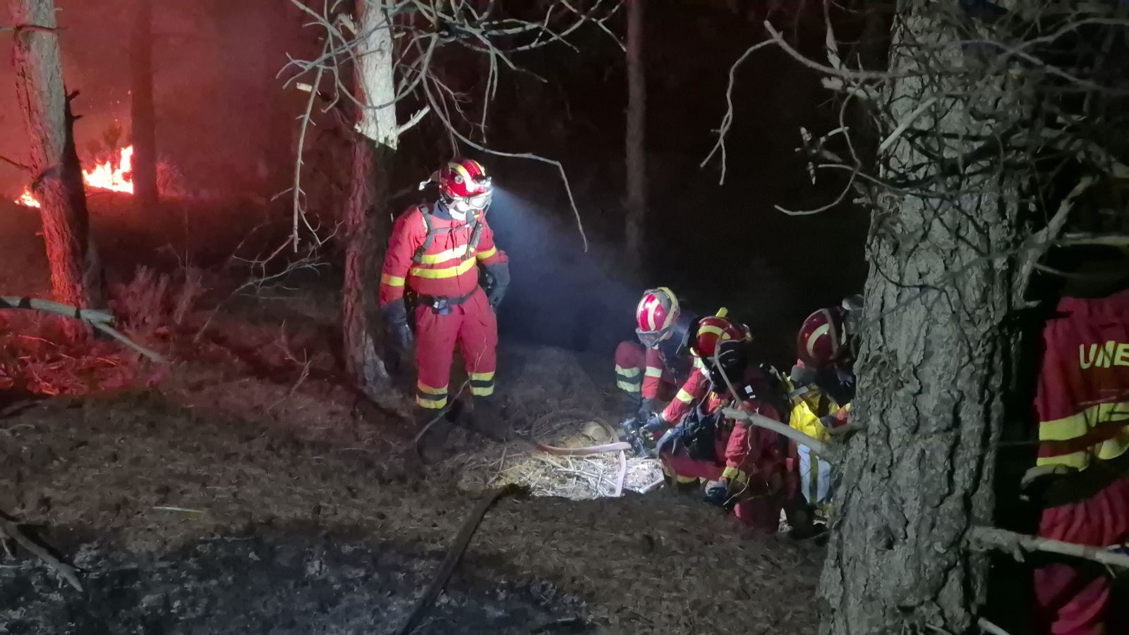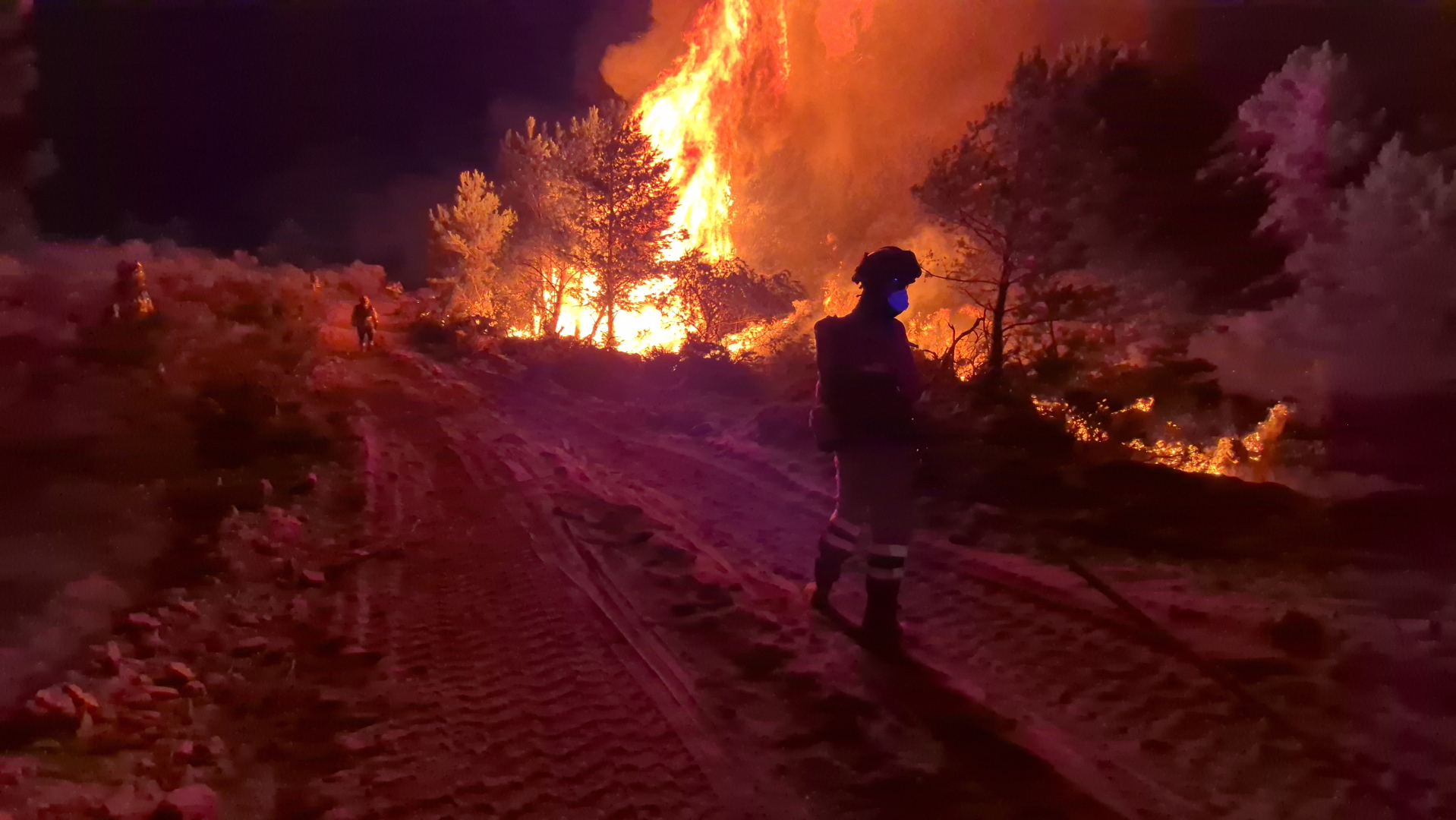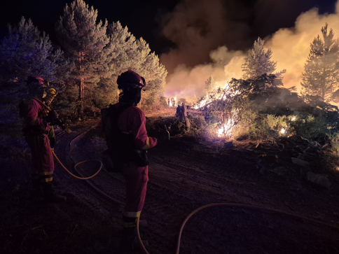 El Pico del Lobo, la cota más alta de Castilla-La Mancha, presenta un terreno duro y los vientos que cambian del sur al suroeste pueden disparar las llamas sin aviso. En un claro, un pelotón de la UME traza zanjas defensivas: con azadas y batefuegos arrancan vegetación seca y remueven el suelo. La noche es muy oscura, cerrada. Solo es para los propios cánidos que dan el nombre a este macizo, las raposas, búhos y otras especies adaptadas; y para estos soldados que no parecen humanos, junto a las brigadas forestales del Ministerio de Transición Ecológica, los miembros del Plan Infocam de la Junta de Comunidades, bomberos forestales de Castilla y León y Comunidad de Madrid, y bomberos urbanos, incluidos los de Guadalajara capital.