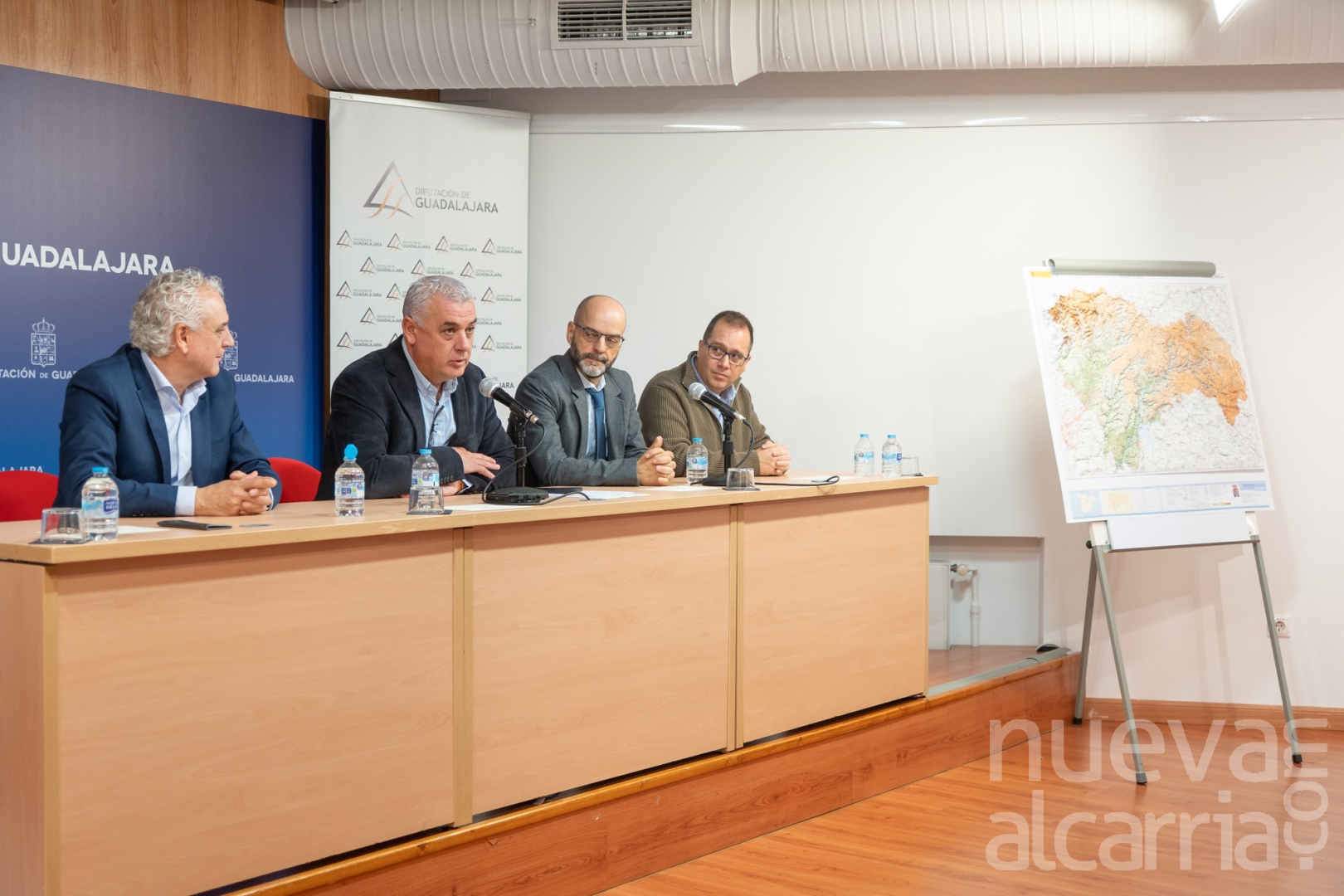 El presidente de la Diputación de Guadalajara, José Luis Vega, ha presentado el mapa provincial 3D junto al Juan José Pérez, director del servicio regional del IGN de Castilla-La Mancha, Juan José Pérez; el jefe de servicio de Cartografía Derivada del IGN, Luis Bernet, y el ex jefe de servicio del área de Infraestructuras de la Diputación hasta su jubilación e impulsor de esta iniciativa, Félix Herranz.