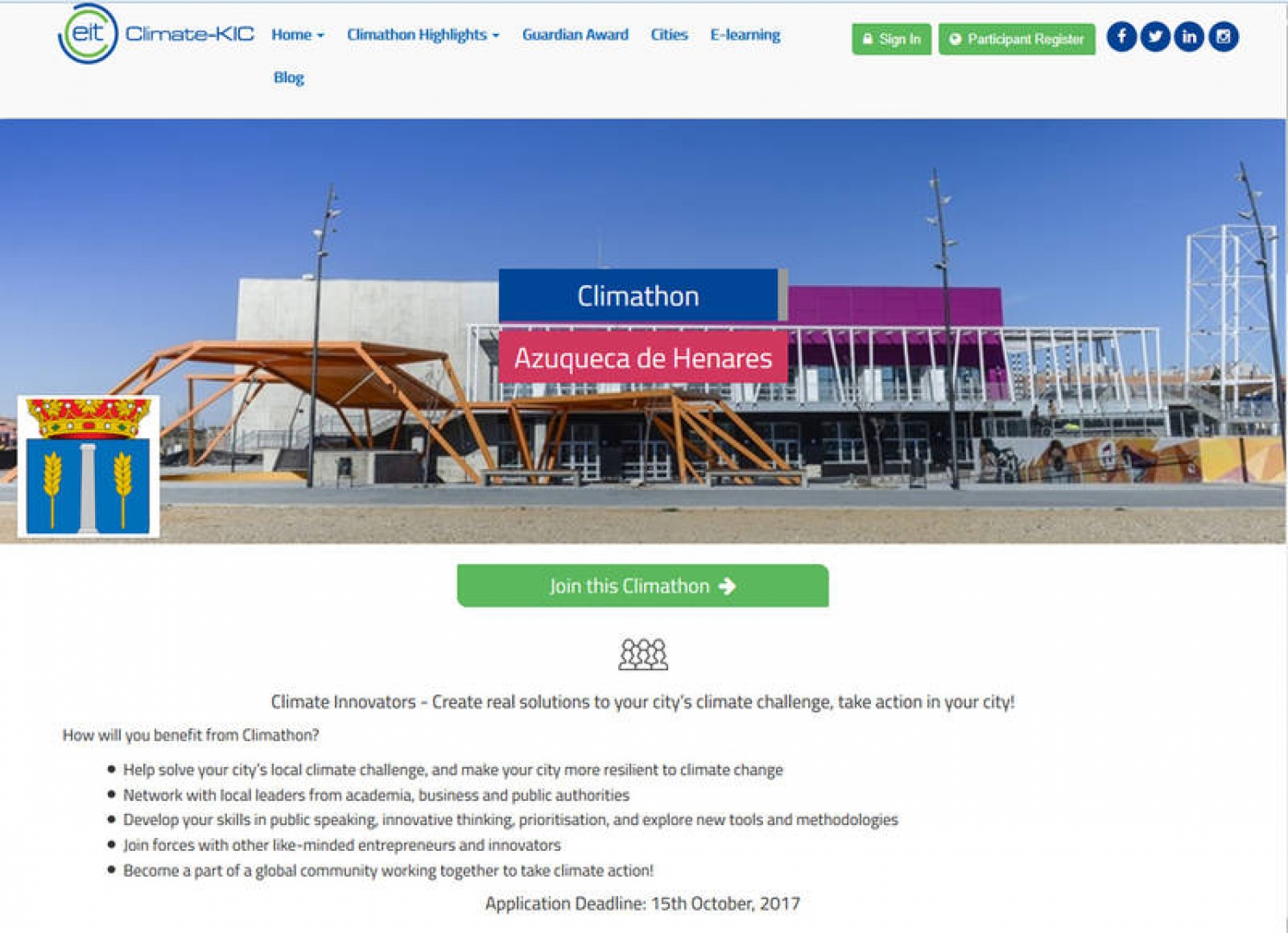 Azuqueca de Henares es una de las ocho ciudades de España que va a participar en la tercera edición de 'Climathon', un proyecto del Centro Español de Innovación en Cambio Climático, que pertenece a la iniciativa europea Climate-KIC y está impulsada por el Instituto Europeo de Innovación y Tecnología. Esta jornada, que se va a celebrar el 27 de octubre en más de cien ciudades de todo el mundo, pretende impulsar ideas emprendedoras que sirvan para proteger el medio ambiente y luchar contra el cambio climático.