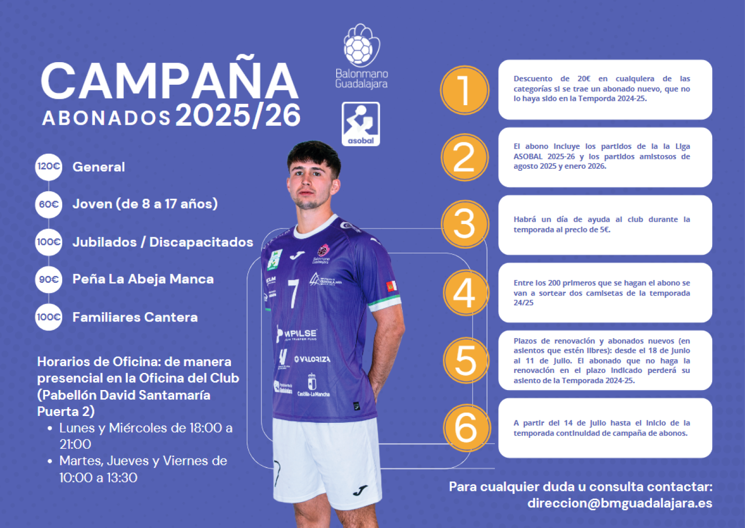 El próximo miércoles 18 de junio arranca oficialmente la campaña de abonos del Balonmano Guadalajara de cara a la temporada 2025/2026 en la Liga ASOBAL. El club alcarreño inicia una nueva etapa con el objetivo de seguir consolidándose en la élite, y lo hace apostando por una campaña pensada para premiar la fidelidad de sus abonados, más de 1.000 la pasada campaña, y atraer nuevas caras al David Santamaría