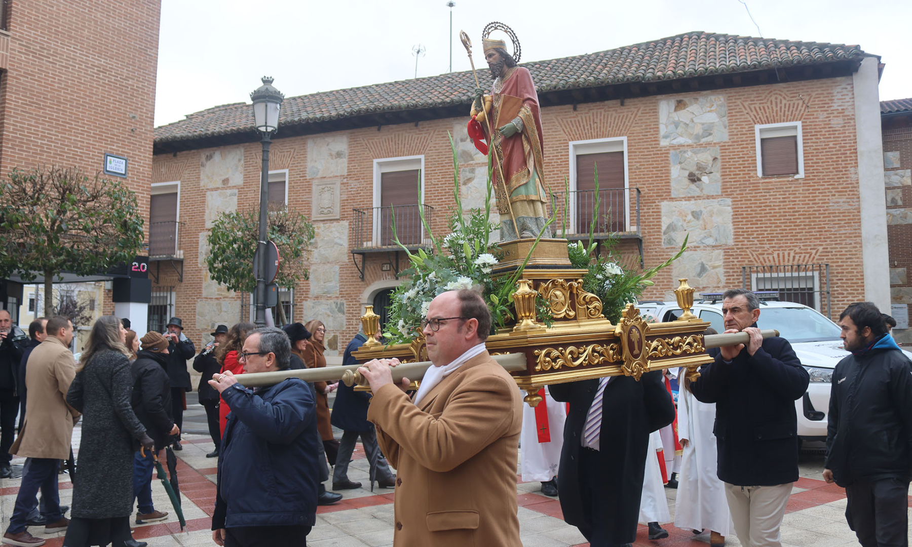 A las 12 en punto el agua dio algo de tregua, y la Plaza de la Iglesia se llenó de vecinos y vecinas con idea de sacar en procesión a la imagen de San Blas, pero finalmente el cura párroco optó por ser prudente, y ante el riesgo de nuevas precipitaciones, optó por acortar la procesión prevista, de modo que el santo salió en andas por la propia Plaza, pero no recorrió las calles del casco. Una vez regresada la imagen al templo, comenzó la Misa Mayor, concelebrada, y en la que la homilía la ofreció el sacerdote José Montejano, cura invitado y párroco de la vecina localidad de Villanueva de la Torre. Fue una ceremonia cantada, con la presencia en la Iglesia de San Pedro y San Pablo, un año más, de la magnífica «Coral Deleitia» que dirige Celia Alcedo.