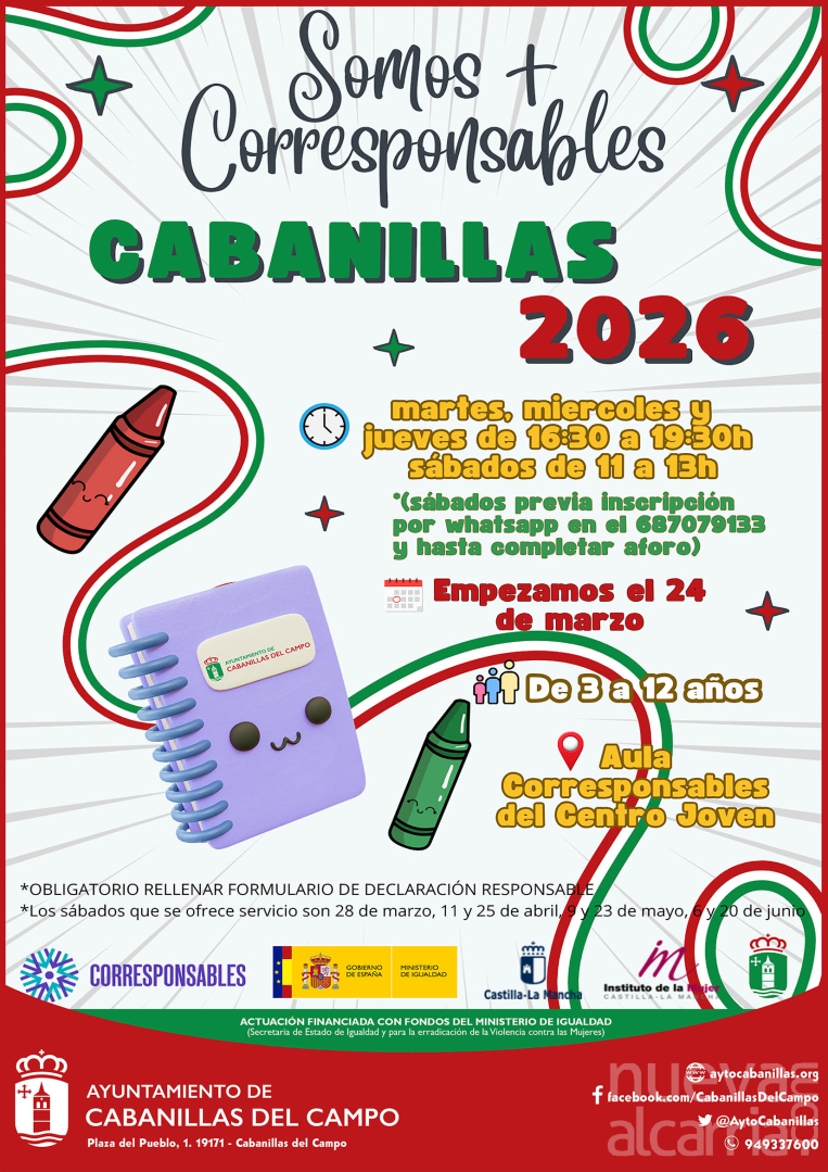 Esta iniciativa «Somos + Corresponsables» en Cabanillas está cofinanciada en un 75% por Plan Corresponsables del Ministerio de Igualdad del Gobierno de España y por la Junta de Comunidades de Castilla-La Mancha, mientras que el Ayuntamiento asume el 25% restante de la actuación.