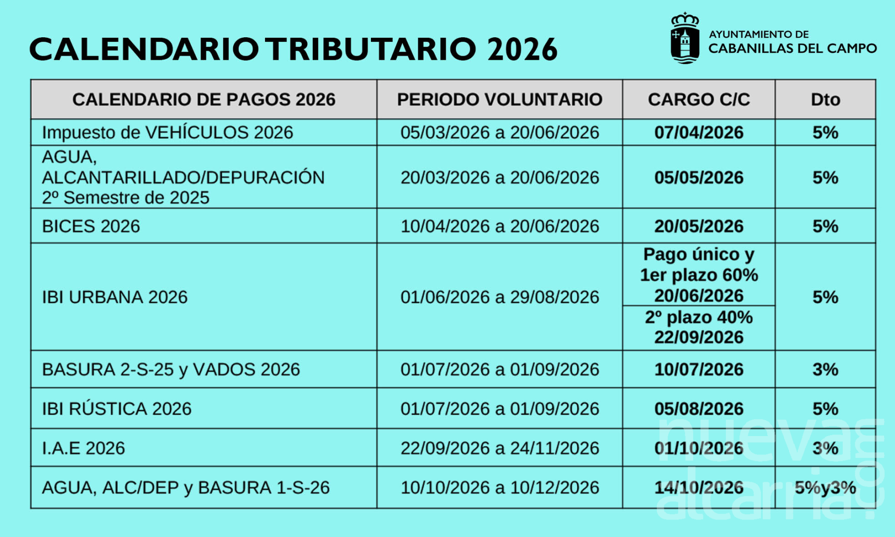 Con fecha del pasado 23 de enero de 2026, el Ayuntamiento de Cabanillas del Campo publicó y mandó al Boletín Oficial de la Provincia el calendario que va a regir el pago de los distintos tributos municipales a lo largo del presente año. Este «Calendario Tributario» establece básicamente en qué fechas se puede efectuar el abono de cada uno de los impuestos establecidos en el llamado «periodo voluntario» de cada uno de ellos, así como la fecha concreta en la que se pasará al cobro de modo automático en el caso de aquellos vecinos, vecinas y empresas que tienen domiciliados los recibos.