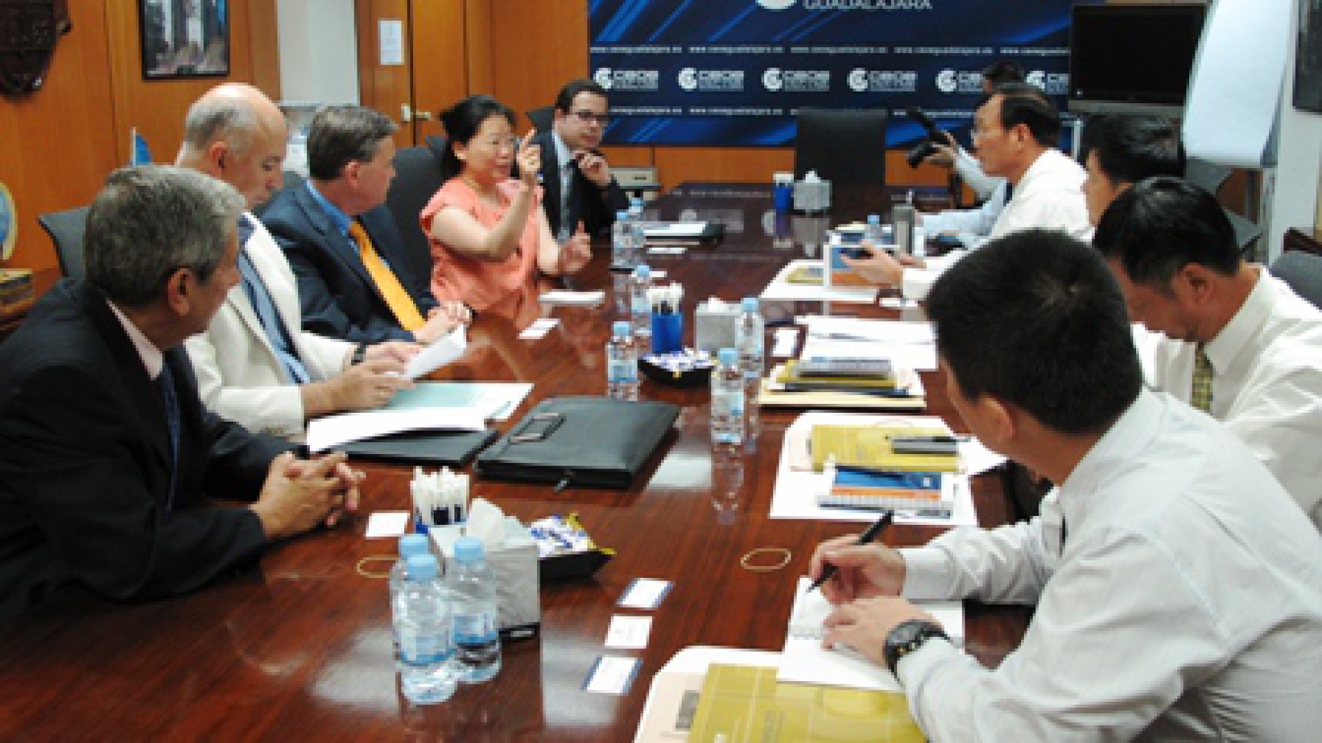 El director gerente de CEOE-CEPYME Guadalajara, Miguel Cambas, junto con Alberto Domínguez, diputado de Promoción Empresarial de la Diputación Provincial de Guadalajara, Agustín Carrillo, responsable del departamento Jurídico de la patronal alcarreña y Juan Pablo Piqueras, abogado consultor, se han reunido esta mañana con una delegación china de Cantón que se han desplazado hasta Guadalajara para ver como se trabaja en la resolución de los conflictos sociales, concretamente, los chinos estaban interesados en el sistema de relaciones laborales entre las empresas, trabajadores y el gobierno.