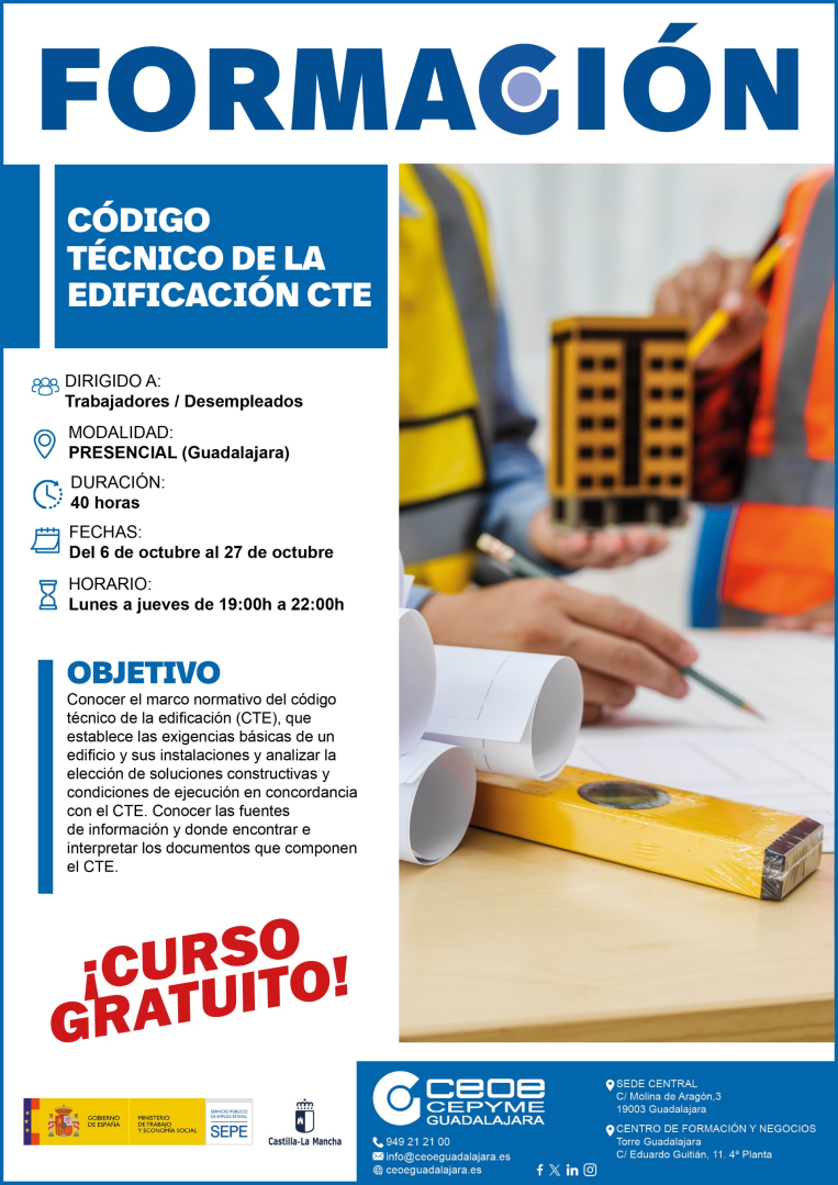 El departamento de Formación de CEOE-Cepyme Guadalajara ha lanzado un curso gratuito basado en el “Código técnico de la edificación CTE”, que dará comienzo el próximo 6 de octubre, con una duración de 40 horas y en la modalidad de presencial con un horario de lunes a jueves de 19:00 a 22:00 horas.