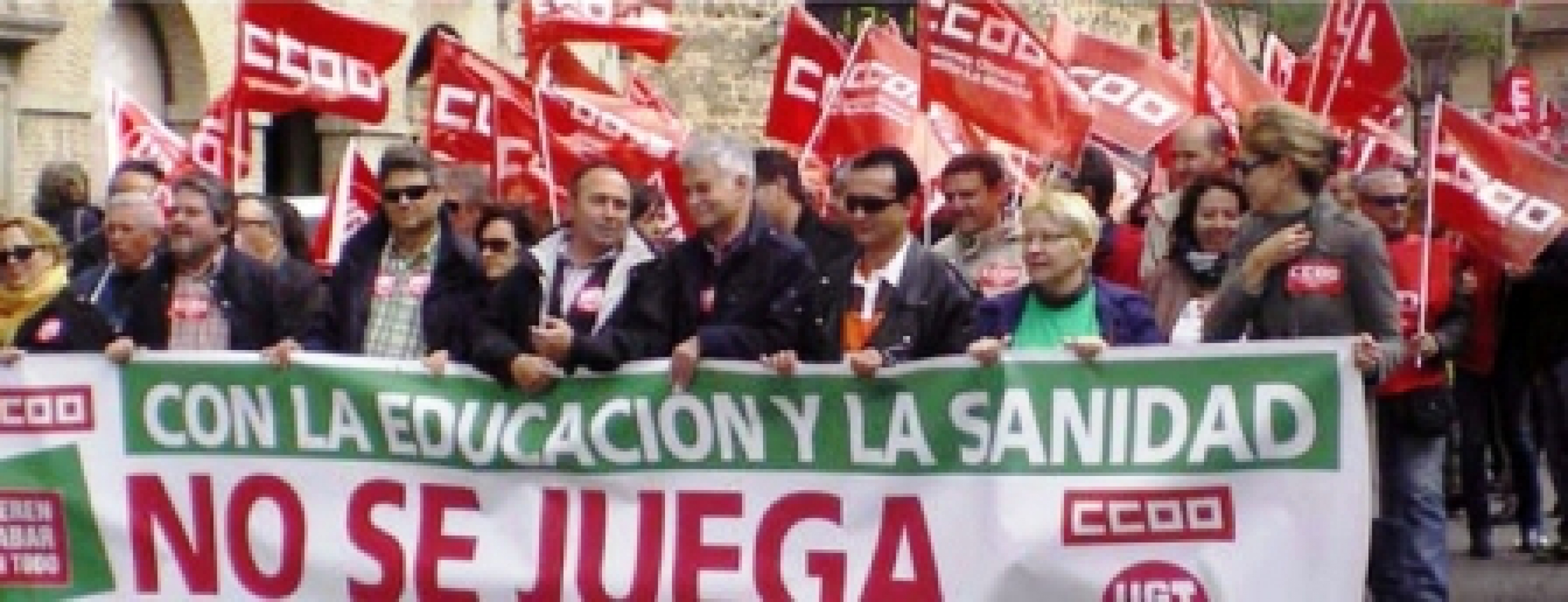 Cerca de 15.000 personas se han manifestado esta mañana en las cinco capitales de provincia de Castilla-La Mancha bajo el lema "Con la sanidad y la educación no se juega", para exigir a los gobiernos de Rajoy y de Cospedal que cambien sus políticas porque "lo público no se vende, se defiende". Convocadas por CCOO, UGT y la Plataforma Social en defensa del Estado de Bienestar y los Servicios Públicos, las manifestaciones han transcurrido pacíficamente, bajo la lluvia en Toledo y en Albacete, con los manifestantes coreando eslóganes de denuncia de las políticas del PP en España y en Castilla-La Mancha.