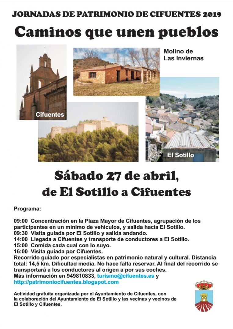 Este próximo sábado 27 de abril tendrá lugar la tercera Jornada de Patrimonio prevista para 2019 por el Ayuntamiento de Cifuentes, recorriendo el antiguo camino entre El Sotillo y Cifuentes. El recorrido permite apreciar la transición entre la paramera del borde de la Cordillera Ibérica y las estribaciones de la Alcarria Alta.
