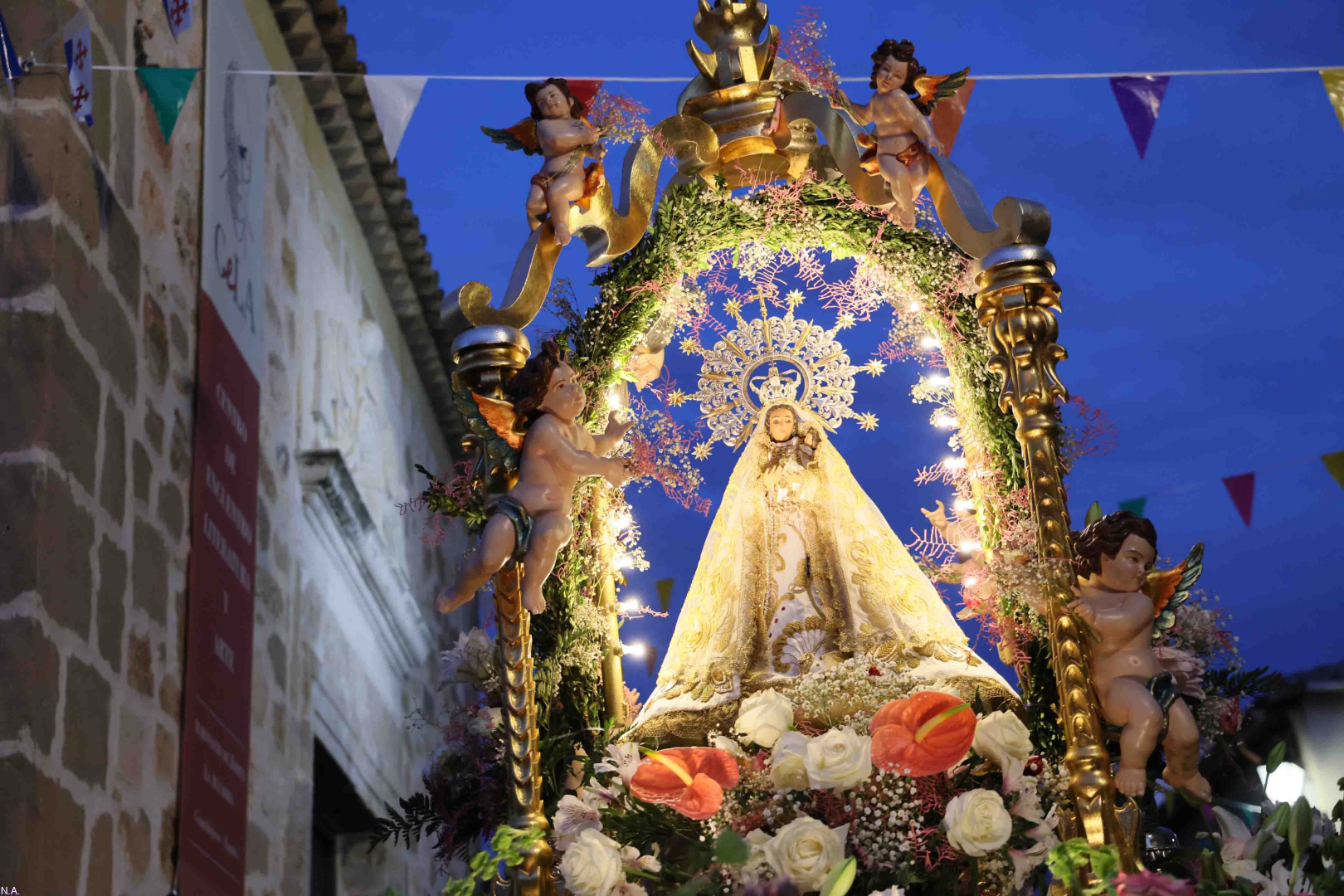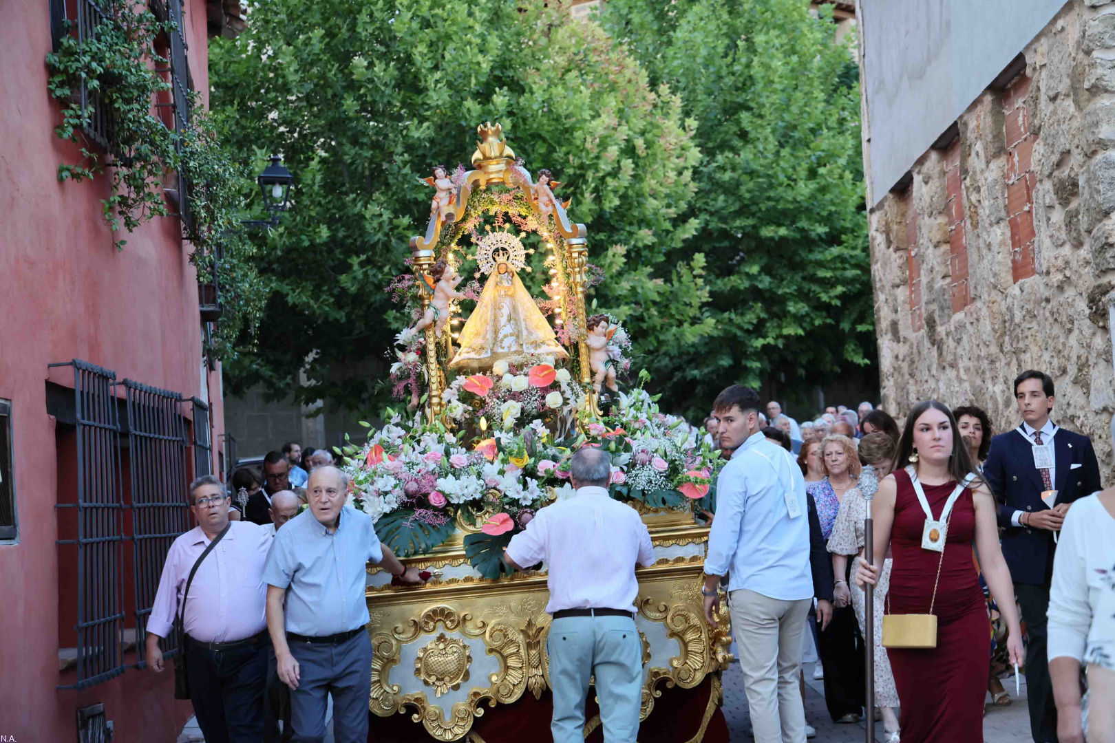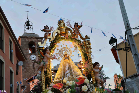 Ya por la tarde, a las ocho en punto, la Virgen de la Luz volvió a recorrer en procesión las calles del pueblo sobre la carroza donada por los vecinos el 8 de septiembre de 1974, en un itinerario que hunde sus raíces en el siglo XVI. La Virgen vestía en esta ocasión un manto de salida de la década de 1970, regalo de la familia Huerta, bordado en oro sobre fondo blanco y con el escudo de Almonacid en la cola, una seña de identidad presente en la mayoría de las vestiduras de procesión. La corona que portaba, de oro y plata, restaurada hace apenas un año, es posterior a la Guerra Civil y forma parte del extenso ajuar que ha llegado hasta nuestros días gracias a la custodia celosa de la Hermandad y sus camareras.