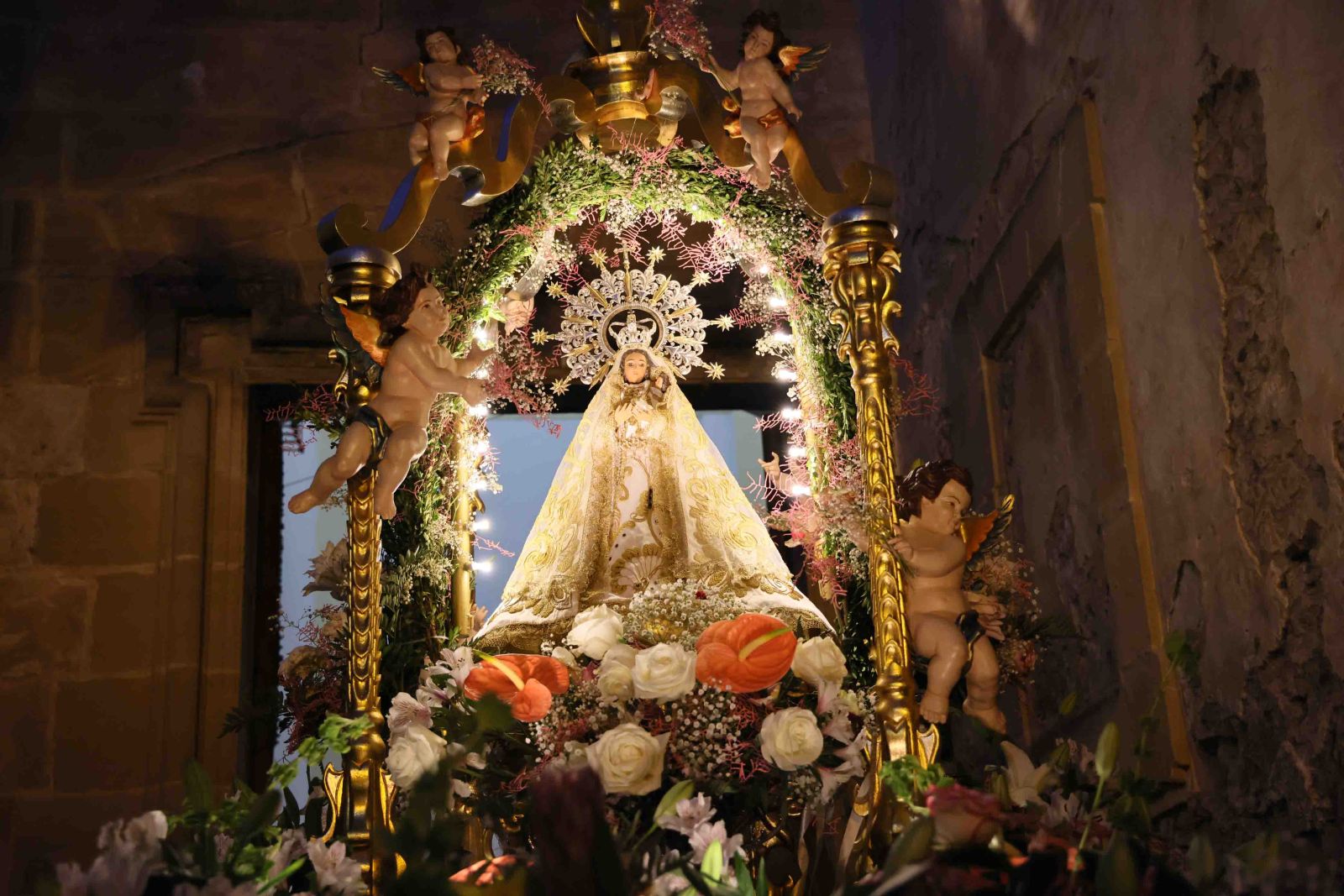 La mañana comenzó con la misa mayor en la Ermita de la Virgen de la Luz, donde la imagen de la Virgen presidía el altar, engalanada con mimo por las camareras y camareros de su Hermandad. El adorno floral fue obra del restaurador local Sergio Mínguez, quien diseñó y combinó con gran delicadeza lirios, proteas y anturios, buscando un efecto más natural y voluminoso que en años anteriores. Aunque contó con la colaboración del pueblo, que donó parte de las flores, fue él quien consiguió dar armonía y carácter al conjunto. Este año, además, se recuperó la tradición de elaborar el arco de flores que rodea a la Virgen y de colocar en las manos de los ángeles pequeños ramilletes preparados para secarse y conservarse en el tiempo, un trabajo minucioso que requiere varias horas de montaje flor a flor. “El pueblo quiere ver a su patrona resplandeciente, y lo hacemos entre todos, pero este año la apuesta ha sido por una decoración más viva y desenfadada, que ha sorprendido y gustado mucho”, explicó Mínguez. La misa, oficiada por el párroco de la localidad, Antonio Delgado, y acompañada por la Rondalla de Almonacid, se convirtió en un acto de comunión espiritual y de identidad compartida.