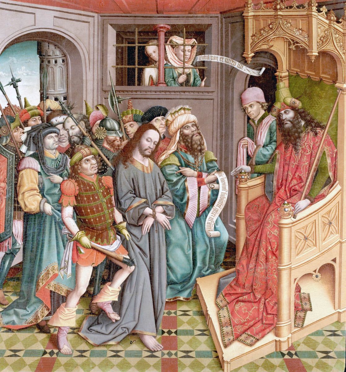 En la pintura, Jesús aparece en el centro, con las manos atadas, en actitud resignada. Cristo va sucintamente vestido de sencilla túnica y aparece en actitud sumisa, frente al gobernador Pilato que, revestido de elegantes túnicas, y tocado de un singular gorro de influencia oriental, se muestra poderoso. A ambos les rodean una serie de figuras que son soldados, sayones, un escriba y algún sacerdote, con rostros que manifiestan sorpresa, resignación o, la mayoría de ellos, soberbia y maldad. Un detalle del cuadro presenta una referencia al evangelio de San Mateo (27:19) cuando dice que durante el juicio a Cristo, la esposa de Pilatos, llamada Claudia Prócula, intercedió por el reo, advirtiendo a su marido que se desentendiera del caso, que ese hombre era justo, y en sueños había visto que habría problemas si le condenaba. Algunas iglesias orientales han considerado santa a Claudia Prócula por esta advertencia. En la tabla que comento, el detalle es contundente: sobre el muro que da a la sala donde se juzga a Cristo, aparece una ventana enrejada, y tras ella dos mujeres. Una (se supone que es Prócula) parece llorar y de su boca sale una frase escrita sobre pergamino que dice “nihil tibi et iusto illi” (nada hagas a ese hombre porque es justo) y tras ella se ve a una joven que la acompaña. Ella viste un completo ajuar medieval, propio de la mitad del siglo XV, tocándose con el típico tocado de cuernos que consistía en sendas trufas laterales, cubiertas de crespinas y amparadas por una toca rosada de bordes festoneados.