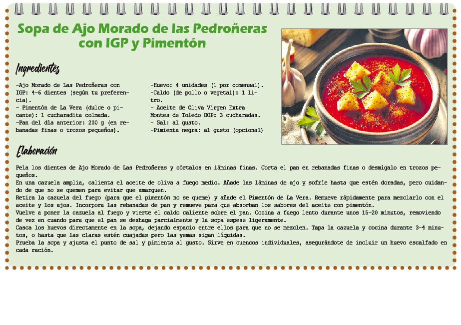 Este ajo es fundamental en guisos, estofados y sofritos de la cocina tradicional manchega. Es el alma del pisto y del ajoarriero. Su alto contenido en alicina lo convierte en un potenciador de sabor, utilizándose tanto en crudo como cocinado para realzar cualquier plato y acompañando estas líneas os proponemos un plato muy de temporada. La Sopa de Ajo Morado de Las Pedroñeras con Indicación Geográfica Protegida y pimentón es una receta tradicional de la gastronomía manchega, especialmente representativa de la región de Las Pedroñeras, famosa por su ajo morado. Este plato, ideal para los días fríos, combina el sabor intenso y aromático de los ajos morados con el toque ahumado y picante del pimentón. Se prepara con ingredientes sencillos como pan, caldo, huevo y un toque de aceite de oliva, creando una sopa reconfortante y llena de sabor. La suavidad de los ajos y el sabor del pimentón hacen de esta sopa una delicia que refleja la esencia de la cocina de Castilla-La Mancha.