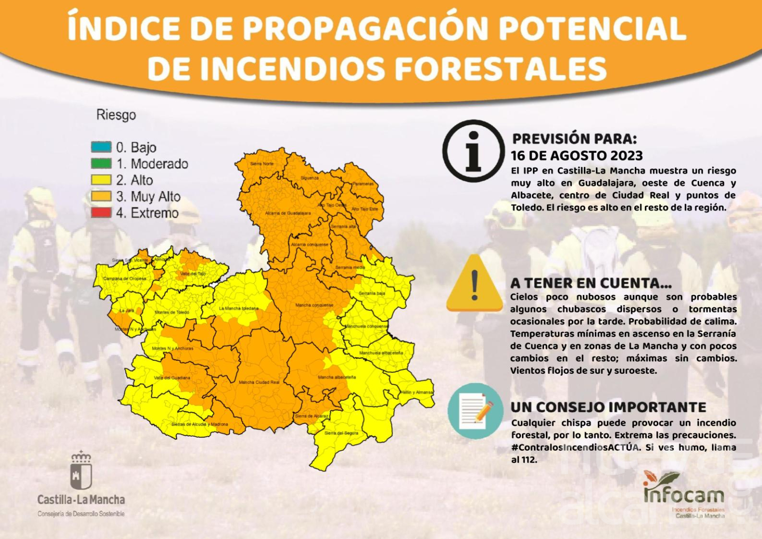 Este nivel de riesgo se extiende también al oeste de Cuenca y Albacete, el centro de Ciudad Real y algunos puntos de Toledo. En el resto de la región, el riesgo es considerado alto.