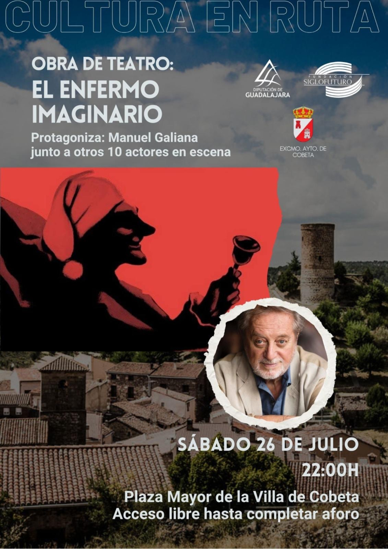 La Plaza Mayor de Cobeta se convertirá en el escenario de una destacada representación teatral este sábado 26 de julio, a las 22:00 horas. La obra "El Enfermo Imaginario" de Molière, protagonizada por el actor Manuel Galiana.