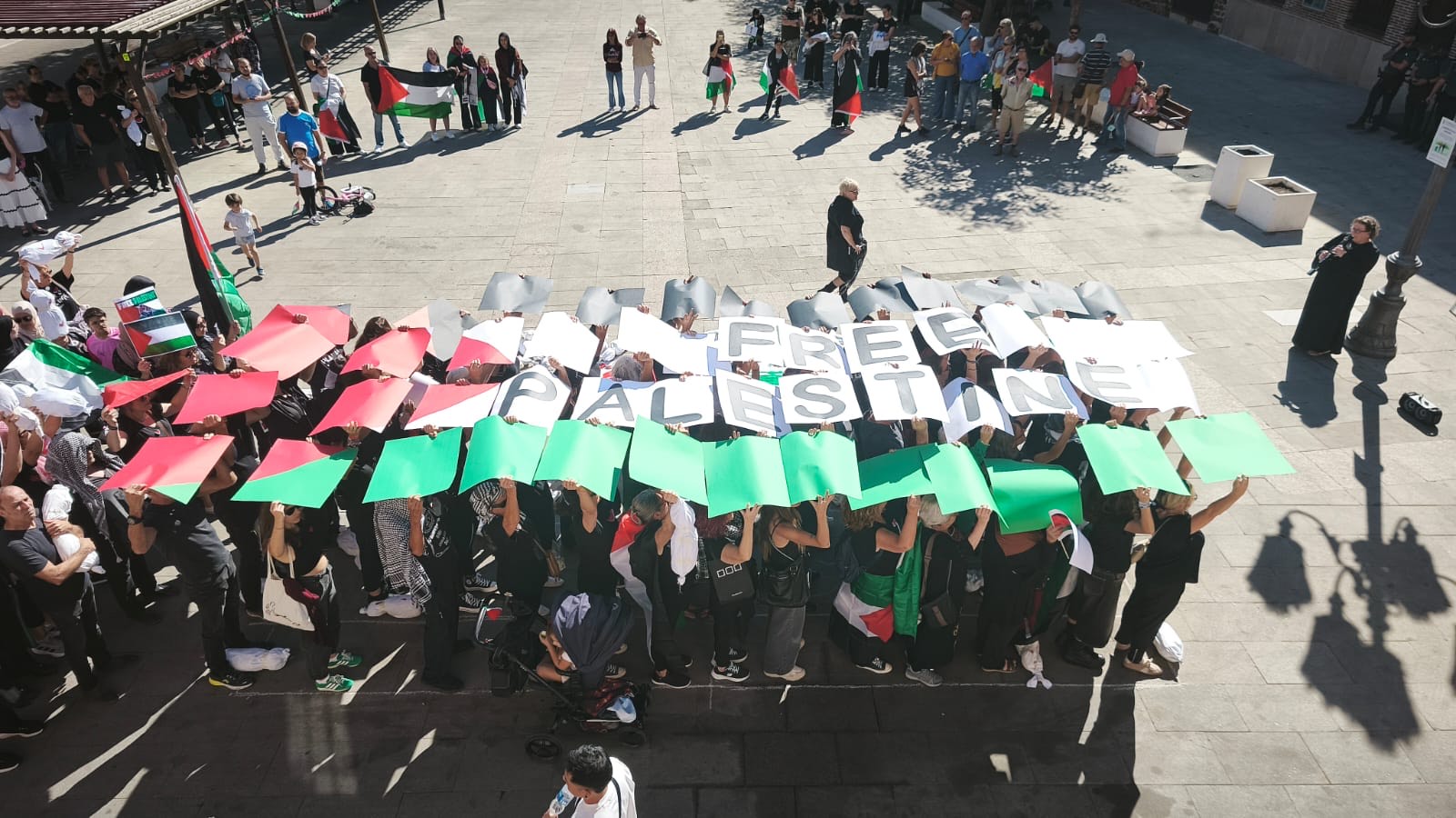 Más de un centenar de personas han participado en una bandera humana con los colores palestinos y en una performance que, posteriormente, ha dado paso a una manifestación hasta la zona de El Calvario, en la que se han coreado consignas como “Free Palestina”. Según los organizadores, más de 150 vecinos y vecinas se sumaron a la cita.
