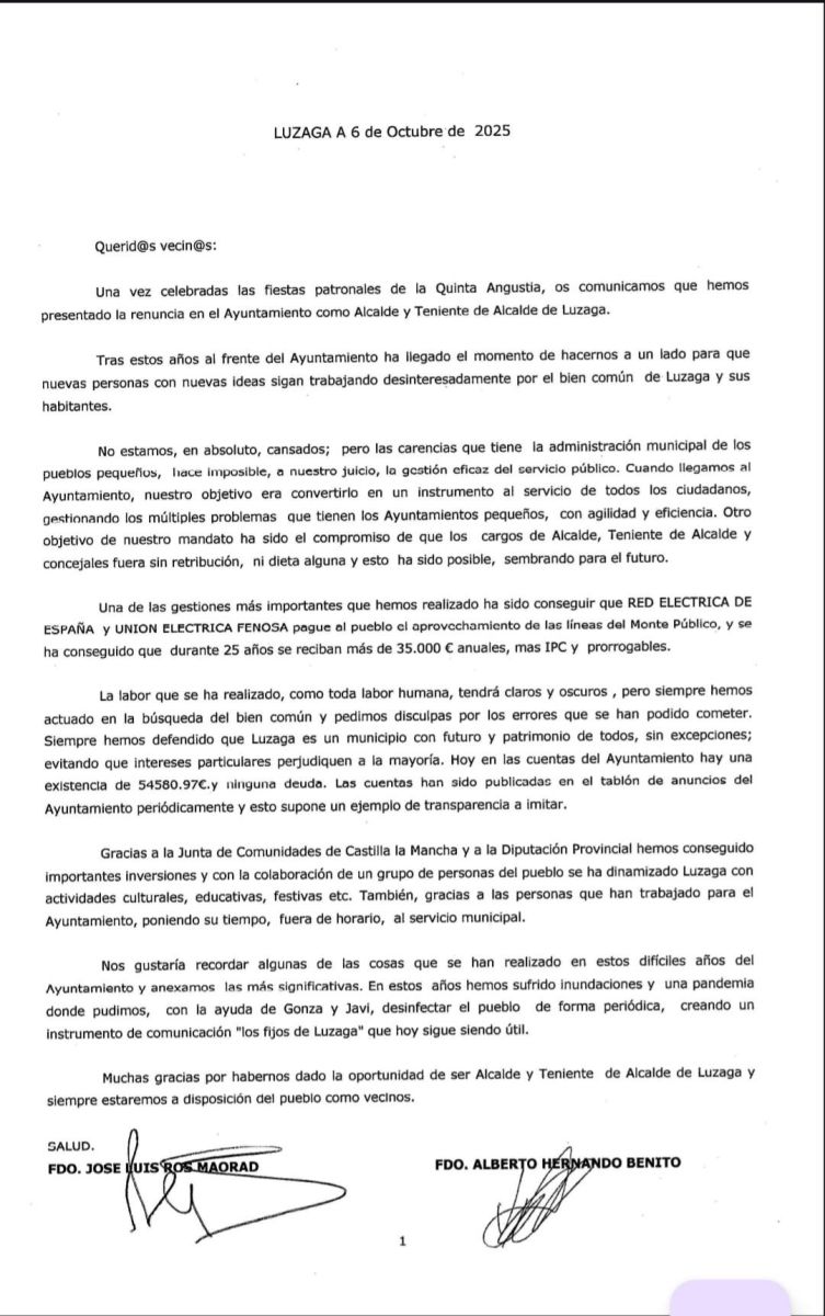 El equipo de gobierno municipal de Luzaga, encabezado por el alcalde, José Luis Ros, y el teniente de alcalde, Alberto Hernando, ha hecho pública, con fecha de hoy, la renuncia a sus cargos "una vez celebradas las fiestas patronales de la Quinta Angustia". El comunicado, dirigido a los vecinos, menciona que la decisión se toma para que "nuevas personas con nuevas ideas sigan trabajando desinteresadamente por el bien común de Luzaga y sus habitantes".