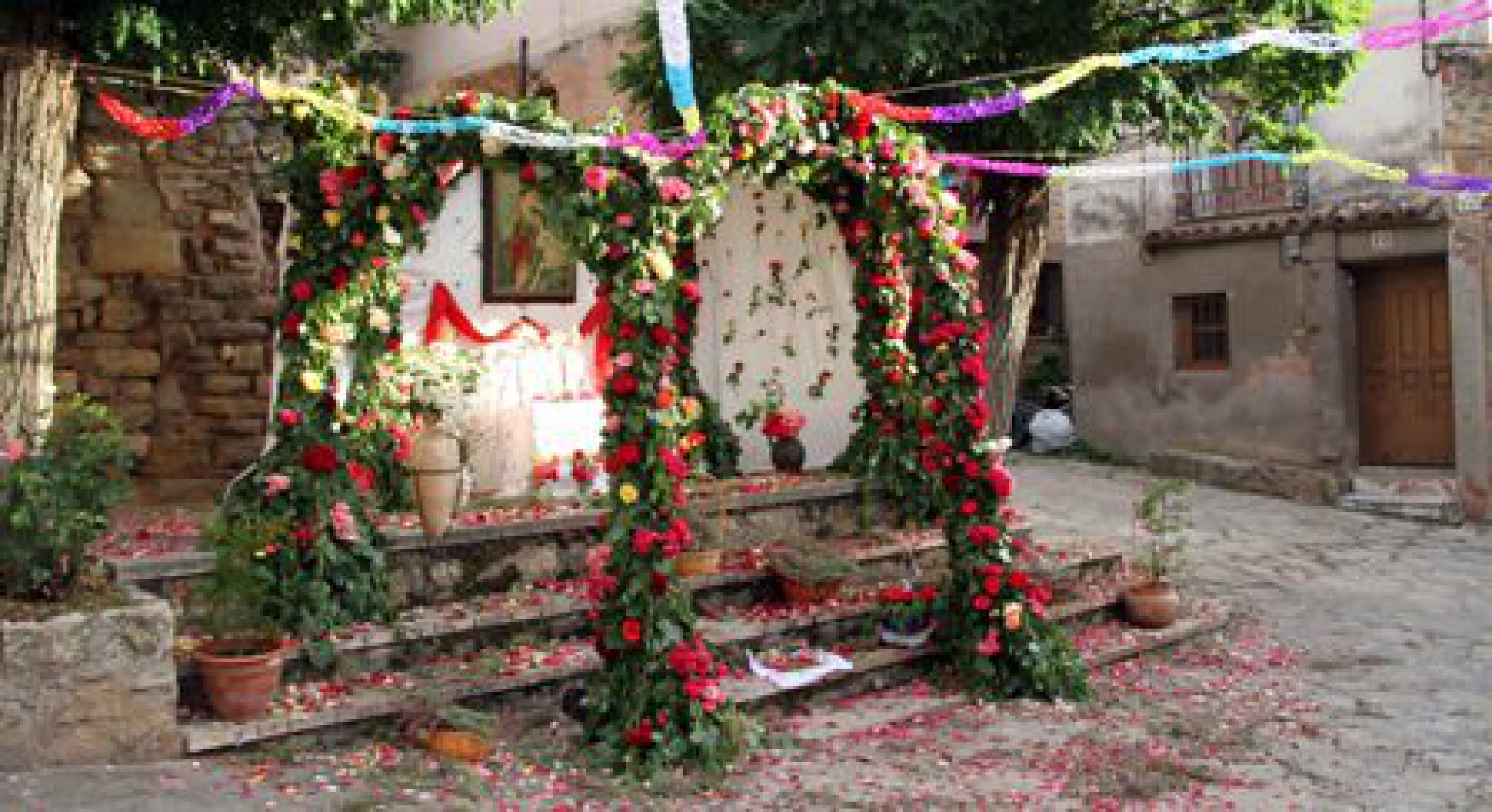 En el centro del arco, estaba un cuadro que habían dibujado los ancianos de la Residencia de San Mateo, a los que rendimos homenaje, destacando su cuadro por encima del tradicional, decía Soraya Alonso, después de bailar una pieza. Además, este año, con serrín de colores, los vecinos habían tejido una alfombra sobre el mismo suelo de la calle que simulaba flores rojas y blancas.