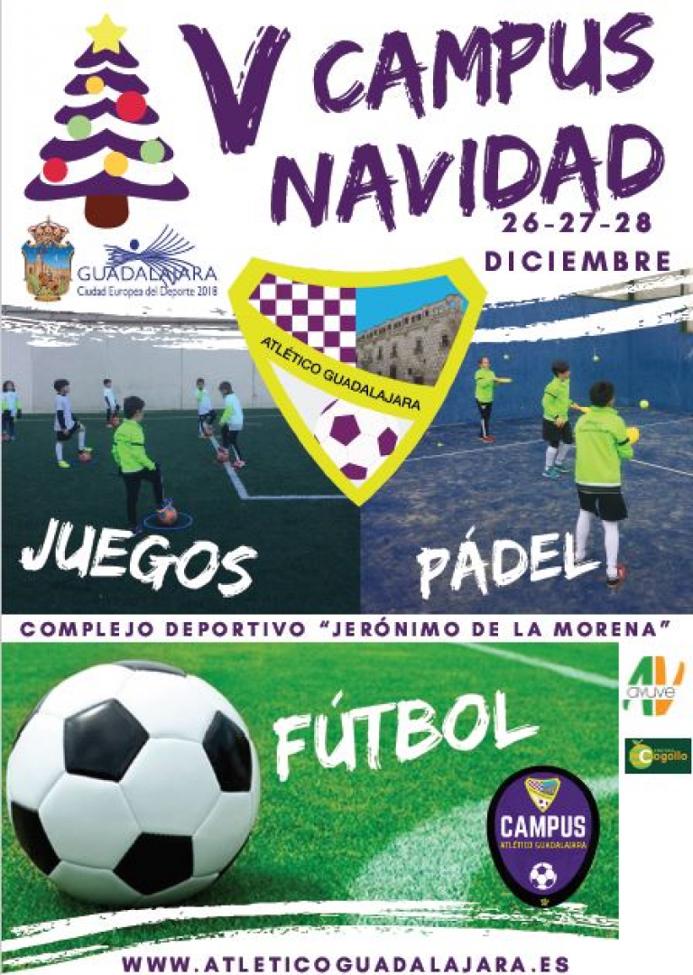 Durante la última semana del año, chicos y chicas de 4 a 14 años están llamados a participar en el V Campus de Navidad del Atlético Guadalajara. Durante tres jornadas (26, 27 y 28 de diciembre), los participantes podrán mejorar sus dotes con el balón, practicar pádel y otros juegos. La actividad tendrá lugar por las mañanas en horario de 10.00 a 14.00 horas, en el Complejo Deportivo Jerónimo de la Morena de Guadalajara.