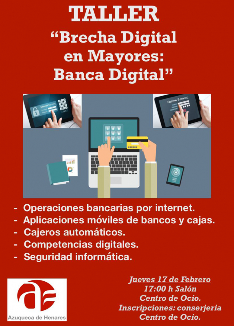 El Ayuntamiento de Azuqueca de Henares ha organizado el día 17 de febrero a las 17.00 horas el taller "Brecha Digital en Mayores: Banca Digital", que estará situado en el salón del Centro de Ocio Río Henares, donde también se podrán realizar las inscripciones para este taller en la zona de conserjería. La concejala de Igualdad, Piedad Agudo, explica que se hace con el objetivo de ayudar "a aquellas personas mayores, menos acostumbradas al uso de las nuevas tecnologías, dado que la banca digital tiene un peso cada vez mayor en la gestión diaria de las finanzas".