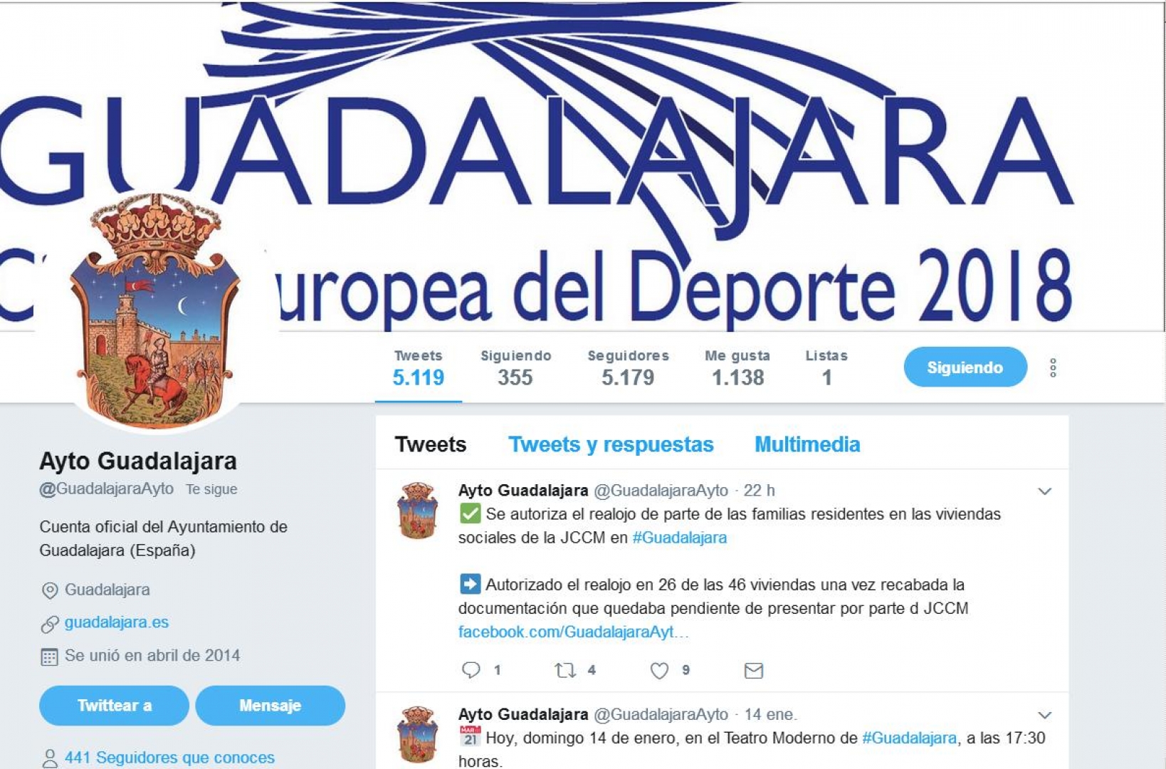 El Ayuntamiento de Guadalajara se ha colocado como el noveno de España que más influencia ha tenido en la red social Twitter en el arranque de 2018 según @TwitterPolEs, cuenta que resalta las mejores prácticas y uso de esta plataforma en cuanto a política, gobierno y participación ciudadana en España.