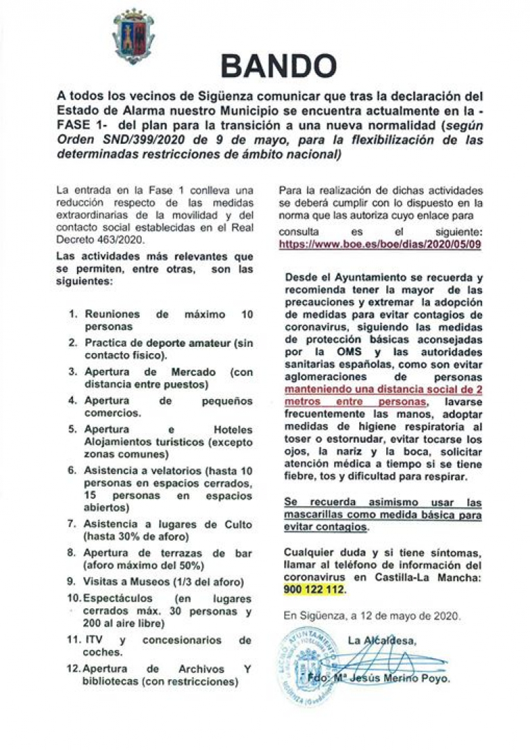 El consistorio de la ciudad del Doncel publica en sus redes sociales un bando informativo anunciando a todos los vecinos que el “municipio se encuentra actualmente en la Fase 1 del plan para la transición a una nueva normalidad.” Y en el bando se pueden ver el resumen de las actividades más relevantes que se permiten en Sigüenza.