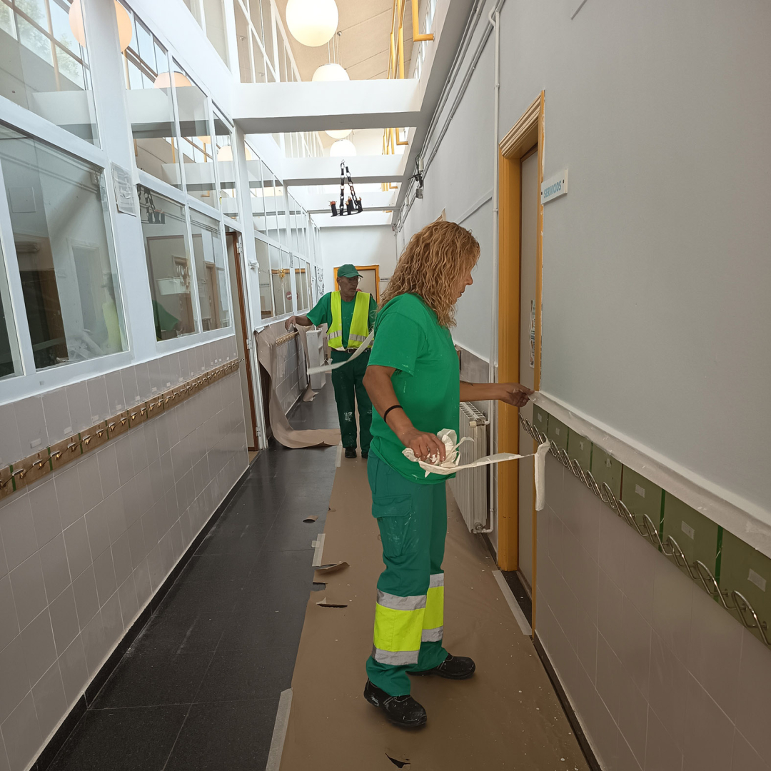 Aprovechando las presencia de los nuevos trabajadores y trabajadoras contratados con el Plan de Empleo de este año, que han reforzado el papel de las Brigadas Municipales, el consistorio ha destinado a estos operarios a realizar labores de pintura en aulas y pasillos que precisaban de un repaso, así como otro tipo de labores, como pequeñas operaciones de albañilería y rellenado de grietas, reposición de enchufes y azulejos, o arreglo de distintos elementos del mobiliario escolar, desde persianas y ventanas, hasta sillas y mesas.