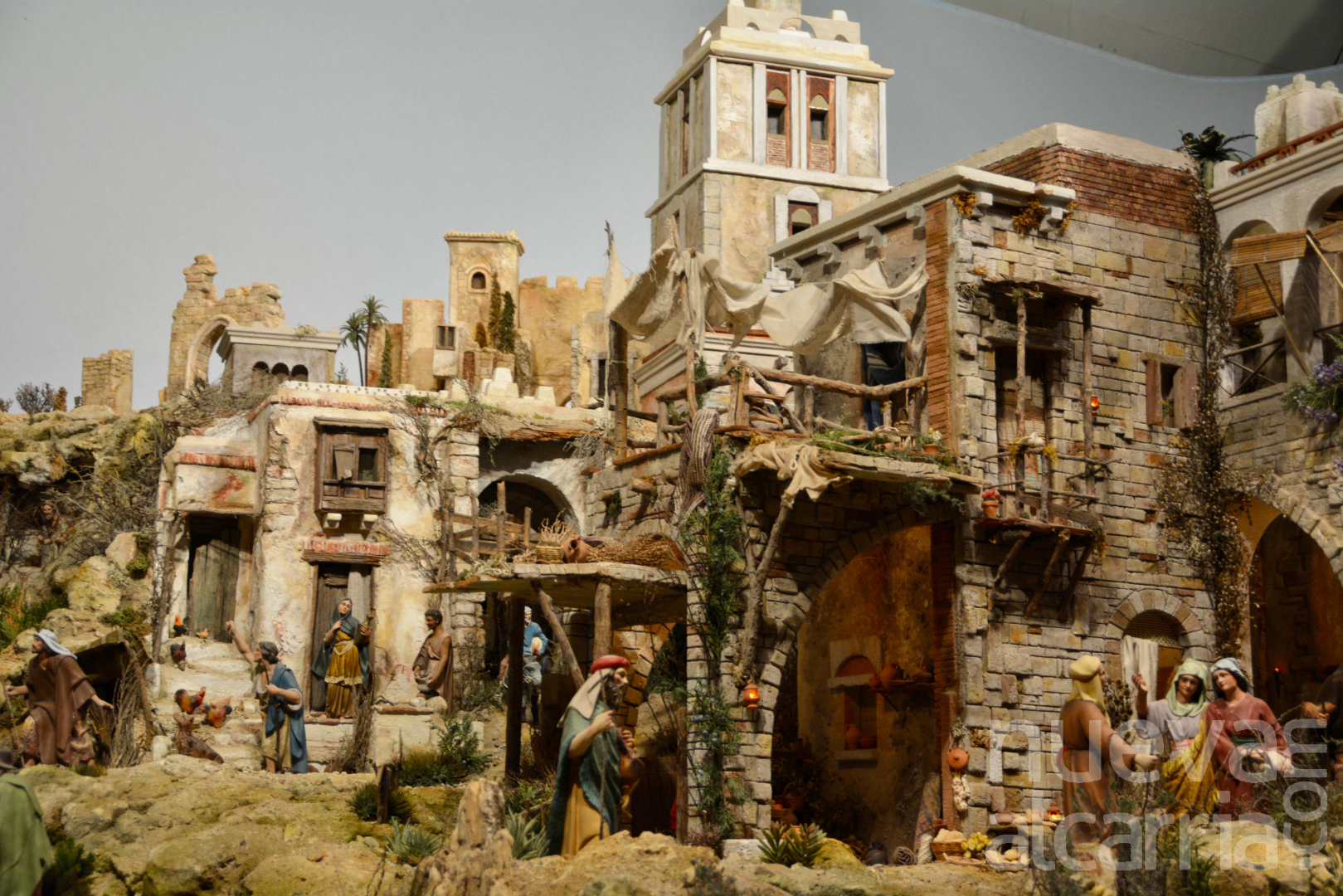 El nacimiento, de formato panorámico, ocupa 45 metros cuadrados y se contempla a través de una embocadura de 8 metros lineales. Presenta un conjunto urbano construido artesanalmente en poliestireno y escayola, con una orografía que combina piedra, arena y corcho con espuma de poliuretano y materiales reciclados como cartón, porexpán, maderas y ropas en desuso. Más de un centenar de figuras –muchas de los talleres de Olot– pueblan la escena entre ríos de agua corriente, norias, un molino en movimiento, mercados y efectos de luz.