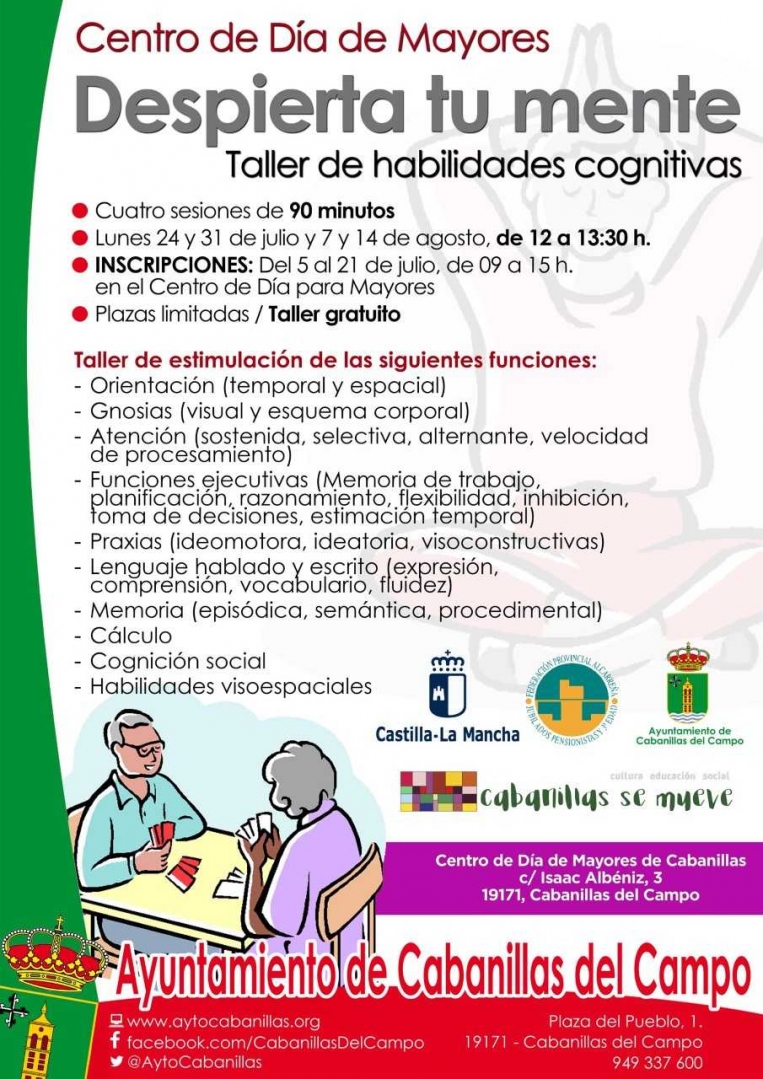 Se trata de un taller que se organiza a través de la Federación Provincial de Jubilados y Pensionistas, que viene financiado por la Junta de Comunidades. Se desarrollará durante cuatro lunes consecutivos, de 24 de julio a 14 de agosto, y en horario de 12 a 13:30 del mediodía.