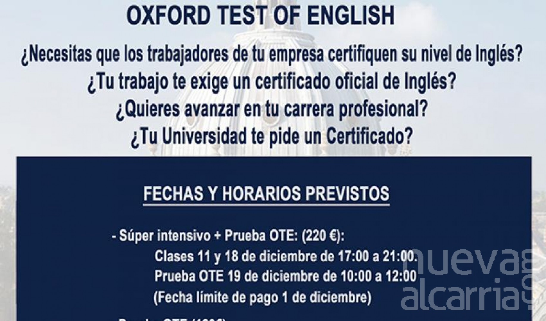 Un examen que aglutina las cuatro competencias, reading, writing, speaking y listening, en sólo dos horas y que muestran escenarios del uso del lenguaje habitual tanto en ámbitos sociales, como laborales y académicos.El alumno que realice la prueba, logrará un certificado expedido por la Universidad de Oxford y que está reconocido por universidades de España y en la casi totalidad de las Comunidades Autónomas, Icex y el ministerio de Educación para los programas Erasmus.Los cursos intensivos preparatorios más la prueba OTE, tienen un coste de 220 euros, y la fecha límite de pago es el martes 1 de diciembre. Mientras que la realización solo de la prueba, tiene un coste de 120 euros y la fecha límite de pago es el lunes 2 de noviembre.Tanto la formación como los exámenes, tendrán lugar en el centro de formación y negocios de CEOE-CEPYME Guadalajara, ubicado en la Avda. Eduardo Gutián, 11, 4ª planta. Aquellos que quieran más información o reservar su plaza, pueden hacerlo en el 949 21 21 00 o a través del correo electrónico bonificacioines.formacion@ceoeguadalajara.es