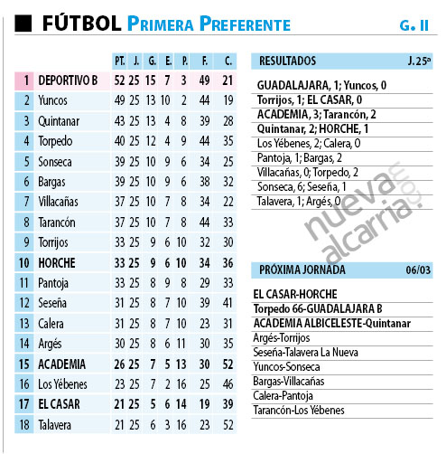 El Deportivo Guadalajara B dio un golpe en la mesa al ganar en casa al Yuncos (1-0) en el partido de la jornada del Grupo II de Preferente, disputado el domingo. La victoria era necesaria para volver a ser líderes en solitario y encarrilar la primera posición y los pupilos de Juanjo San Román se dejaron todo en el terreno de juego.
