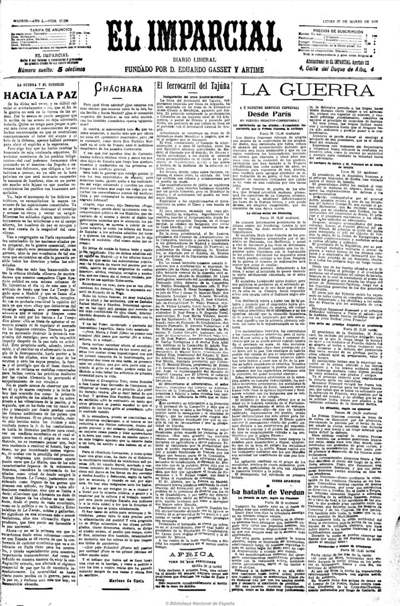 El lunes 27 de marzo de 1916, los quioscos de Madrid amanecían con el ejemplar del diario El Imparcial, un pliego de gran formato que se vendía por cinco céntimos de peseta, que anunciaba la llegada del tren del Tajuña a Mondéjar.