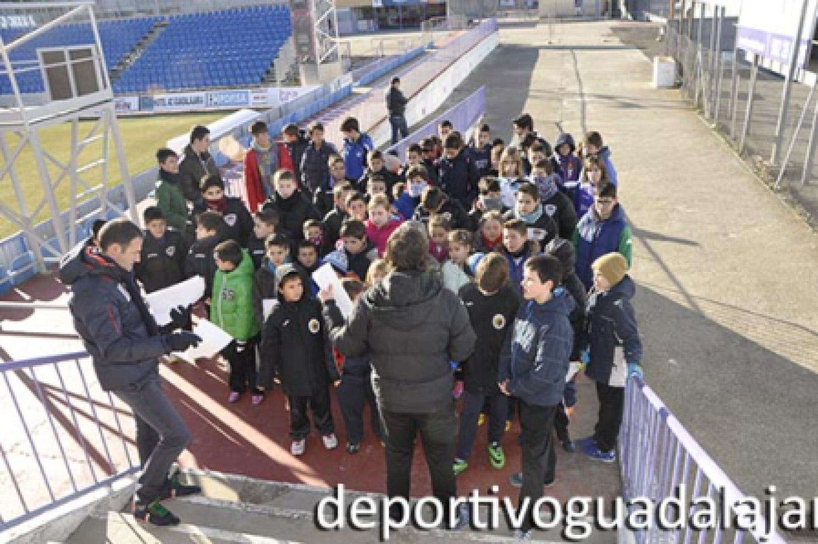 Más de setenta niños y niñas han disfrutado en la mañana de hoy lunes del Tour DeporGuada, una actividad gratuita organizada para esta época navideña por la Fundación C.D. Guadalajara. Guiados por Alberto Ruiz, director de fútbol base del C.D. Guadalajara, y Daniel Retuerta, coordinador de fútbol base del C.D. Guadalajara; los niños, de entre 5 y 16 años, han podido sentir lo mismo que sienten los futbolistas de nuestro primer equipo y han conocido todos los rincones del Municipal Pedro Escartín, desde el aparcamiento privado para jugadores hasta su vestuario, pasando por las cabinas y sala de prensa, el palco, el banquillo o la tienda oficial del club.